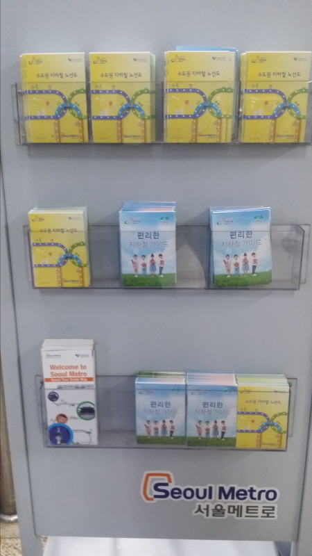(    5) 지난 주 자원봉사 때는 서울메트로 안내리플렛이 동나서 애를 먹었는데, 오늘 와보니 거치대가 최신 노선안내 리플렛으로 빼곡이 채워져 있고, 외국인 관광안내용 릴플렛도 한 코너를 채우고 있어서 흐뭇했다. 선릉역 역장님께 감사드린다. 승객 몇 분이 지나가다가 노선표를 뽑아 가셨다. 그런데 여성 한 분은 작은 사이즈는 없느냐고 물으셨다. 지하철 노선표는 휴대하기에는 작을수록 좋다는 것도 고려해야 할 것 같다
