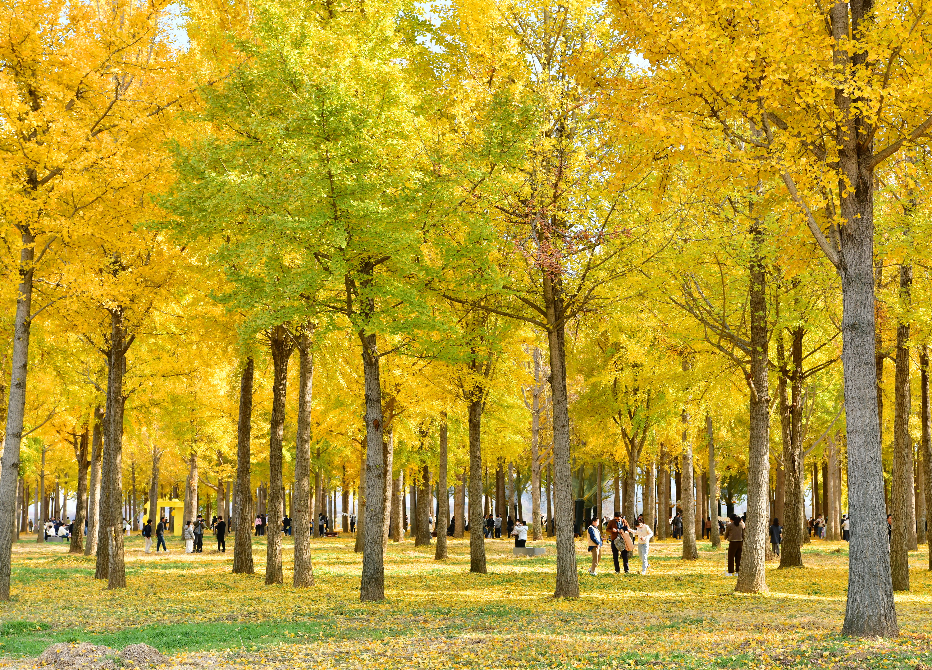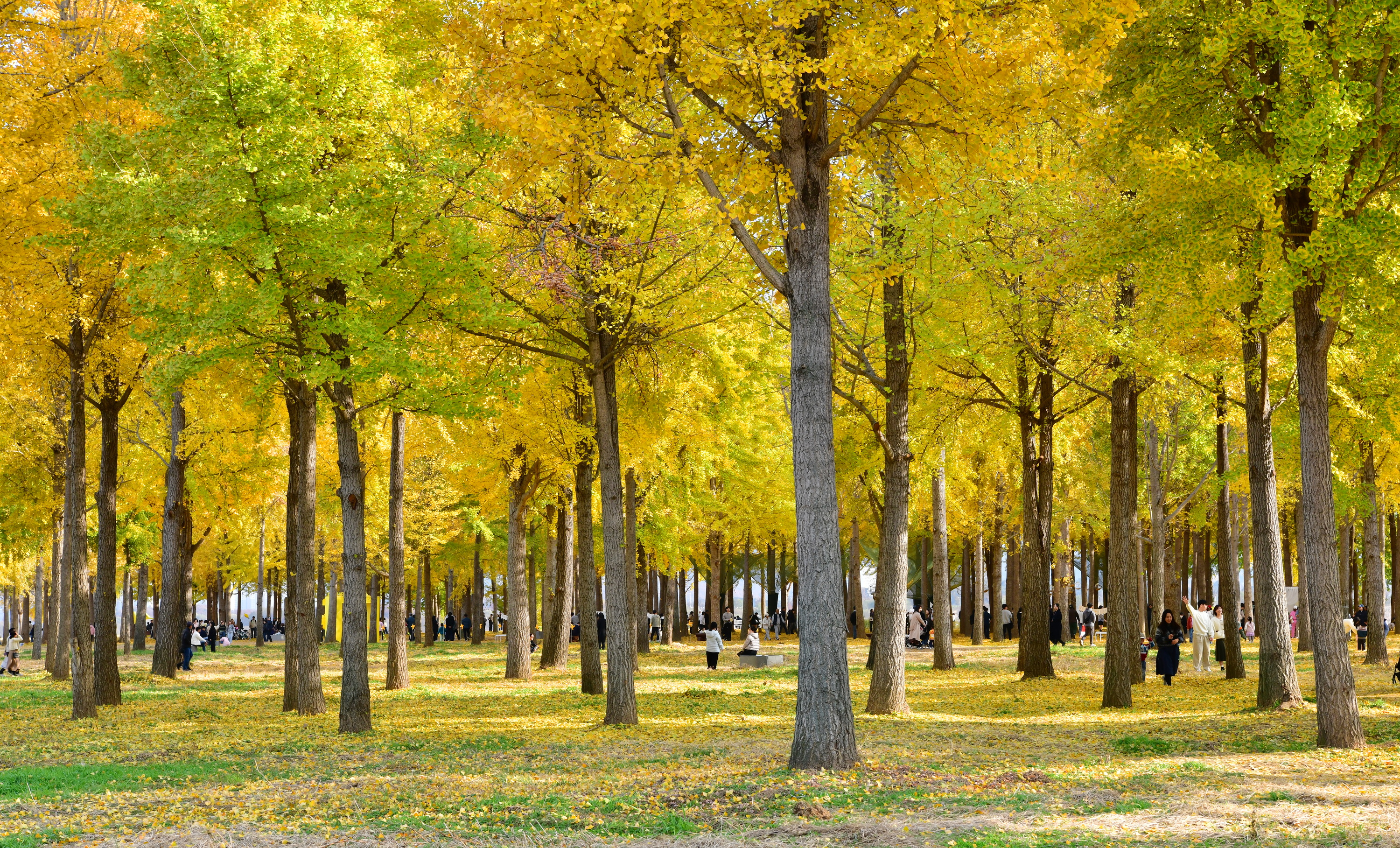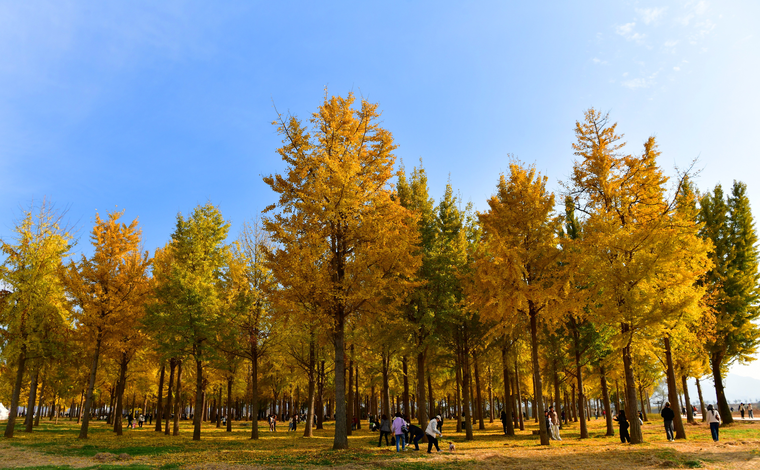 강가 넓은 들판에 키가 큰 은행나무숲에 사람들이 모여든다.