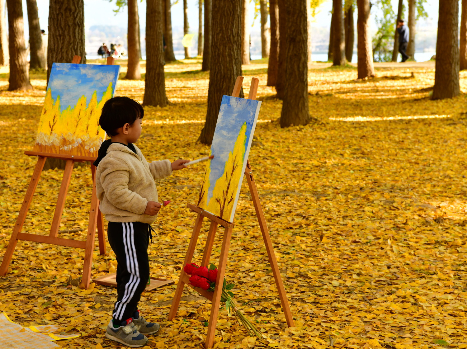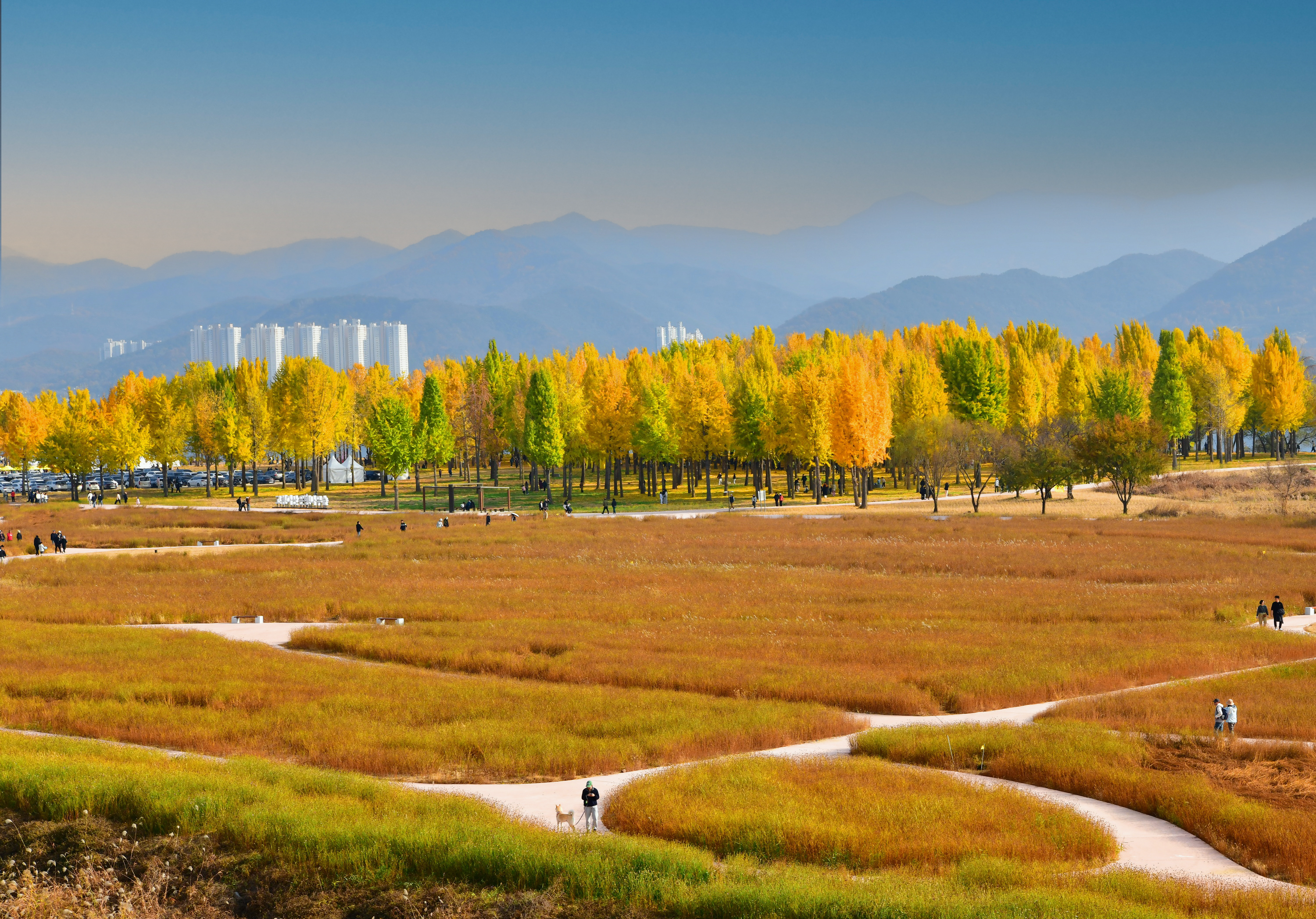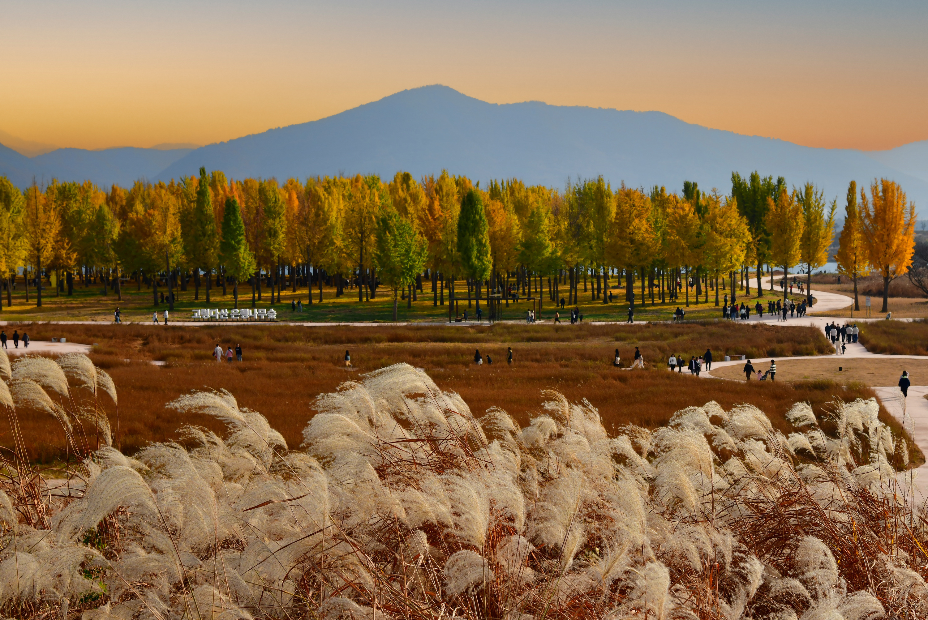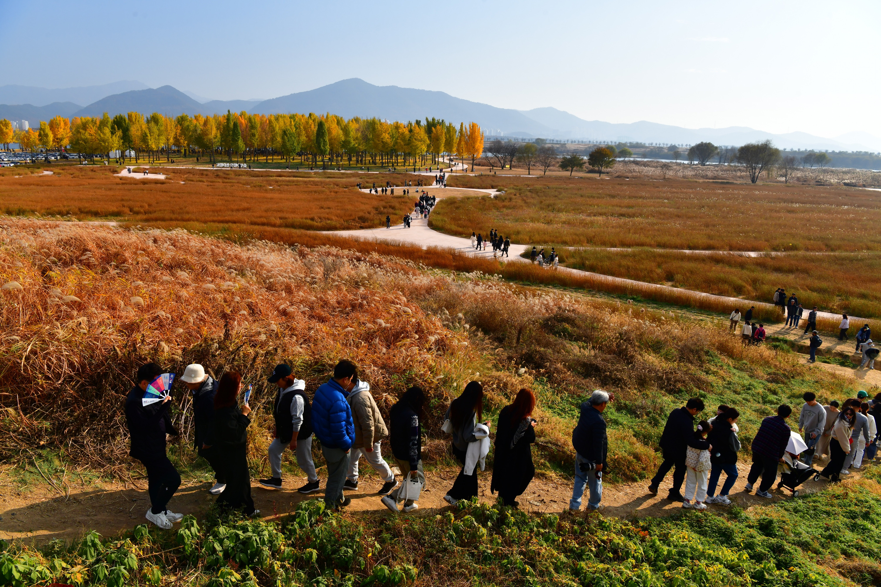 강가 넓은 들판에 키가 큰 은행나무숲에 사람들이 모여든다.