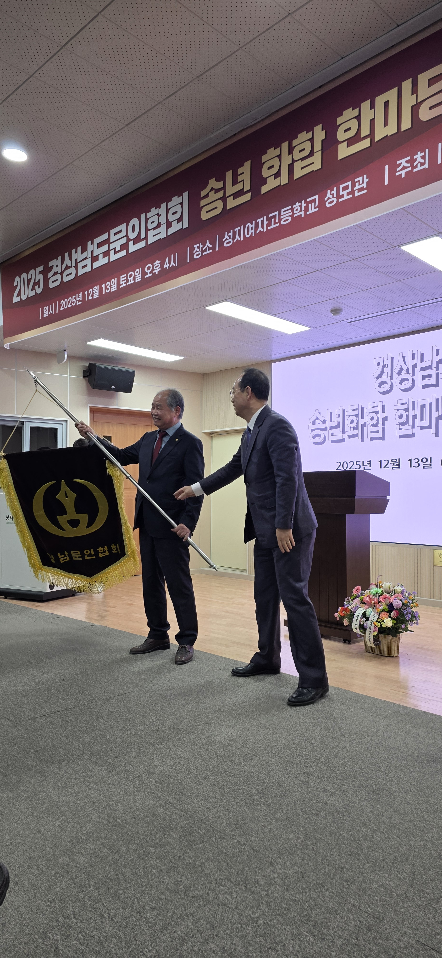 전임 민창홍 회장으로부터 경남문협 회기를 받아 흔들고 있다