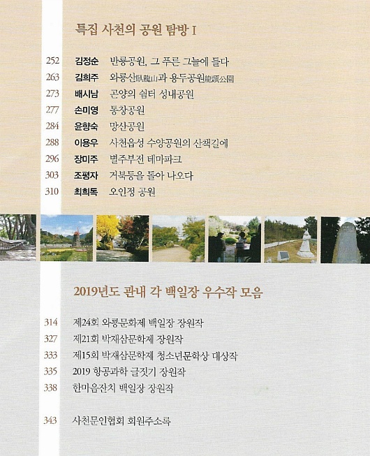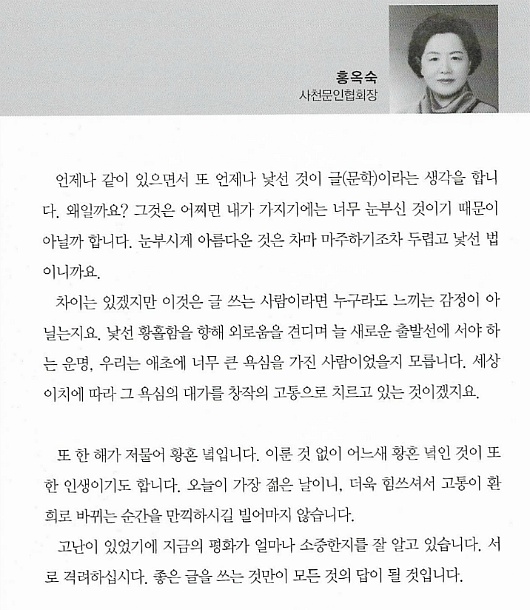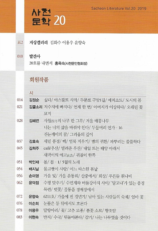 사천문인협회(회장 홍옥숙)에서는 회원작품을 모은 2019년 연간집 <사천문학> 제20호를 펴냈다. 제20호, 2019 『사천문학』 사천문인협회 * 발행일 : 2019년 12월 10일 * 343쪽 * 제작보급처 : 도서출판 경남 * 값 12,000원 * 발간사 / 홍옥숙 사천문인협회 회장 * <사천문학> 제20호 차례 * 수록 시 한편 / 6211호 외1 윤향숙 |