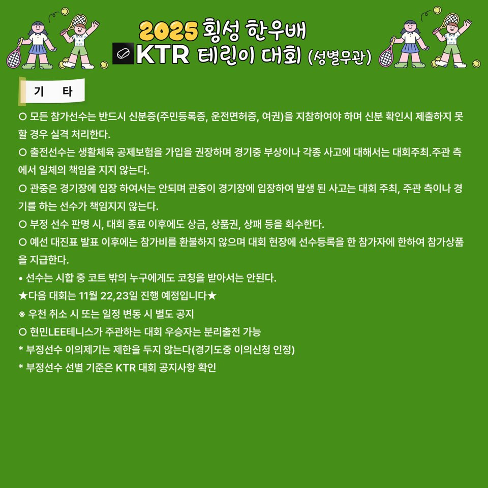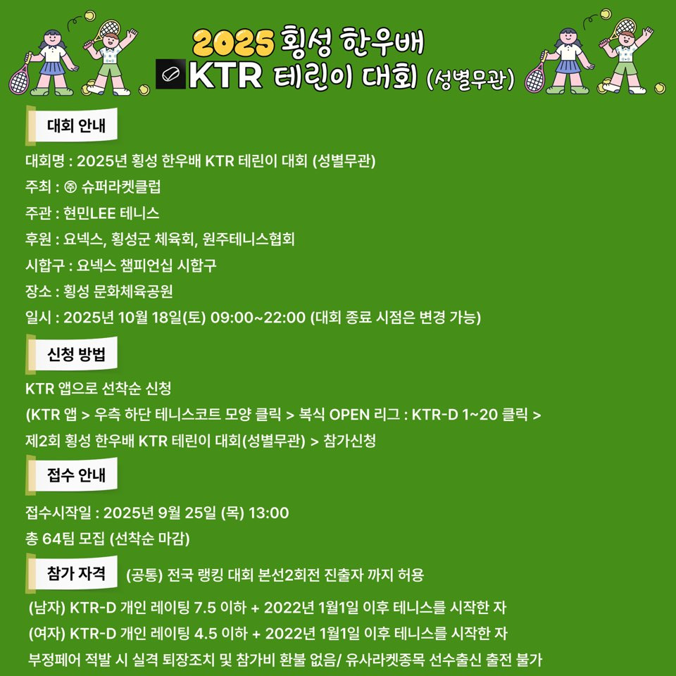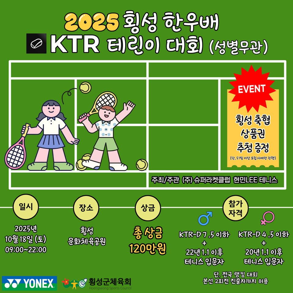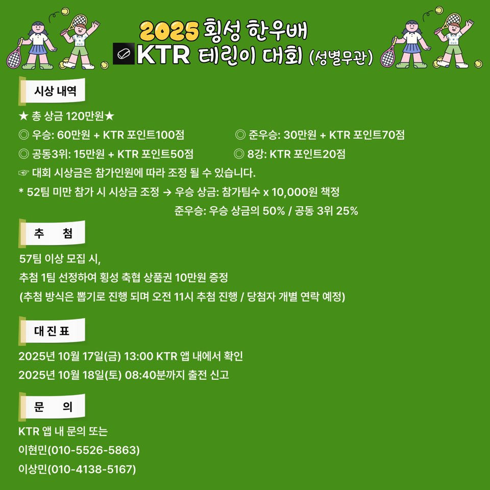 2025 횡성 한우배 KTR 테린이 대회(전국, 테린이 대회) 작성자이상|작성시간25.09.23|조회수297 목록 댓글 0 글자크기 작게가 글자크기 크게가 다음검색 현재 게시글 추가 기능 열기 북마크 공유하기 신고 센터로 신고 댓글 댓글 0 댓글쓰기 답글쓰기 댓글 리스트