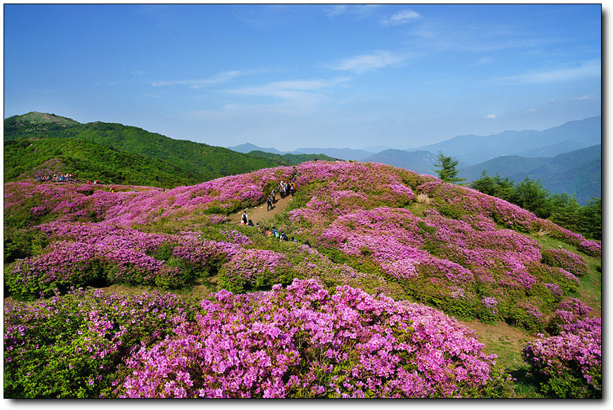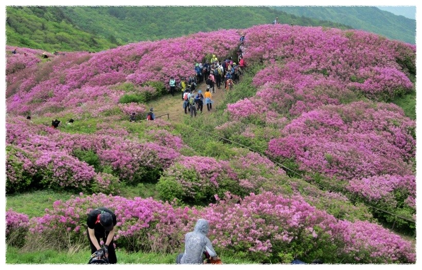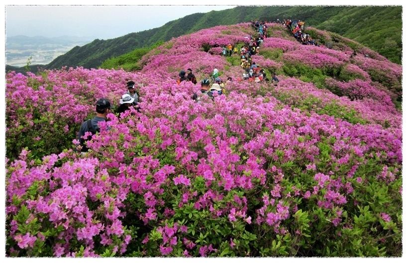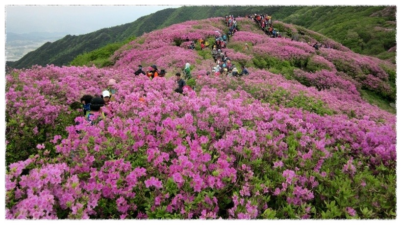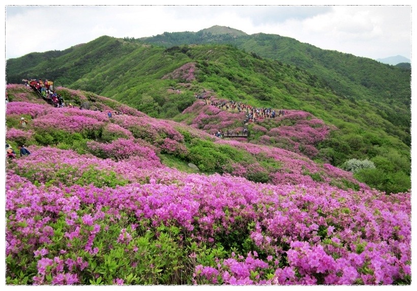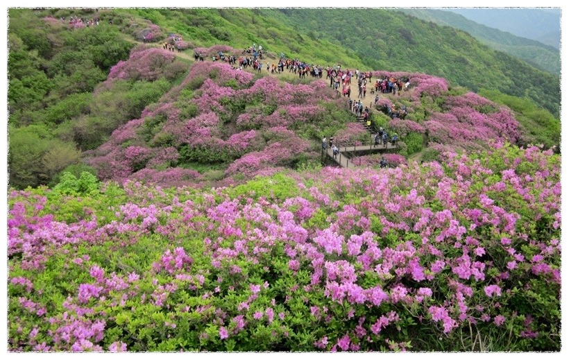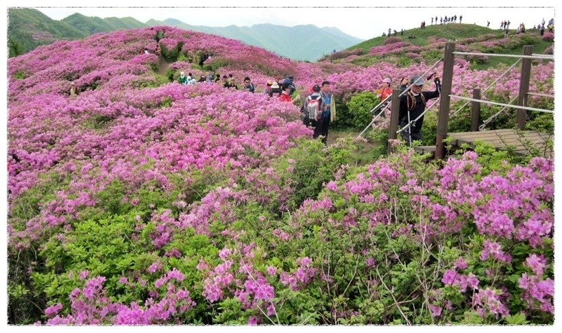 ◉ 산행지 소개 : 지리산 바래봉(1,165m. 전남 남원 운봉) 바래봉은 스님들의 밥그릇인 바리때를 엎어놓은 모습과 닮았다 하여 바래봉이라 붙여졌다고 한다. 둥그스름하고 순한 산릉인데다 정상 주위는 나무가 없는 초지로 되어 있다. 바래봉은 능선으로 팔랑치, 부은치, 세걸산, 고리봉, 정령치로 이어진다. 정상에 서면 지리산의 노고단, 반야봉 촛대봉, 맑은 날엔 멀리 지리산 주봉인 천황봉 까지 시야에 들어온다. 소백산과 함께 우리나라 대표적인 철쭉 명산인 바래봉은 철쭉이 만개하는 5월에 집중적으로 찾는다. 5월중에서도 5월 중순이 철쭉산행의 최적기이다. 지리산의 수백 개 봉우리 중 산 자체로는 (과거에는)그다지 알려지지 않은 산이지만 전국 제일의 철쭉 군락지로 유명해 최근 찾는 사람들이 많아졌다. 지리산에서 가장 유명한 철쭉밭이라면 세석평전을 꼽지만, 지리산을 속속들이 잘 아는 산꾼들은 바래봉을 더 쳐준다. 바래봉 철쭉은 붉고 진하며 허리정도 높이의 크기에 마치 사람이 잘 가꾸어 놓은 듯한 철쭉이 무리지어 군락을 이루고 있다. 산 중간부 구릉지대, 8부능선의 왼쪽, 바래봉 정상아래 1100미터 부근의 갈림길에서 오른쪽 능선을 따라 팔랑치로 이어지는 능선에 철쭉이 군락을 이루고 있다. 특히 가장 화려한 자태를 뽐내는 곳은 바래봉 정상 부근에서 팔랑치에 이르는 약 1.5km 구간으로 팔랑치 부근이 가장 많이 군락을 이루고 있다. 팔랑치에서 능선을 계속 따라 1,123봉으로 오르는 능선에도 철쭉이 군락을 이룬다. |