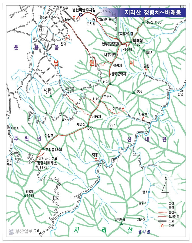 <산행코스> 정령치 휴게소→고리봉→세걸산→세동치→부운치→철쭉 군락지→팔랑치→바래봉→운지암 용산마을 주차장 |