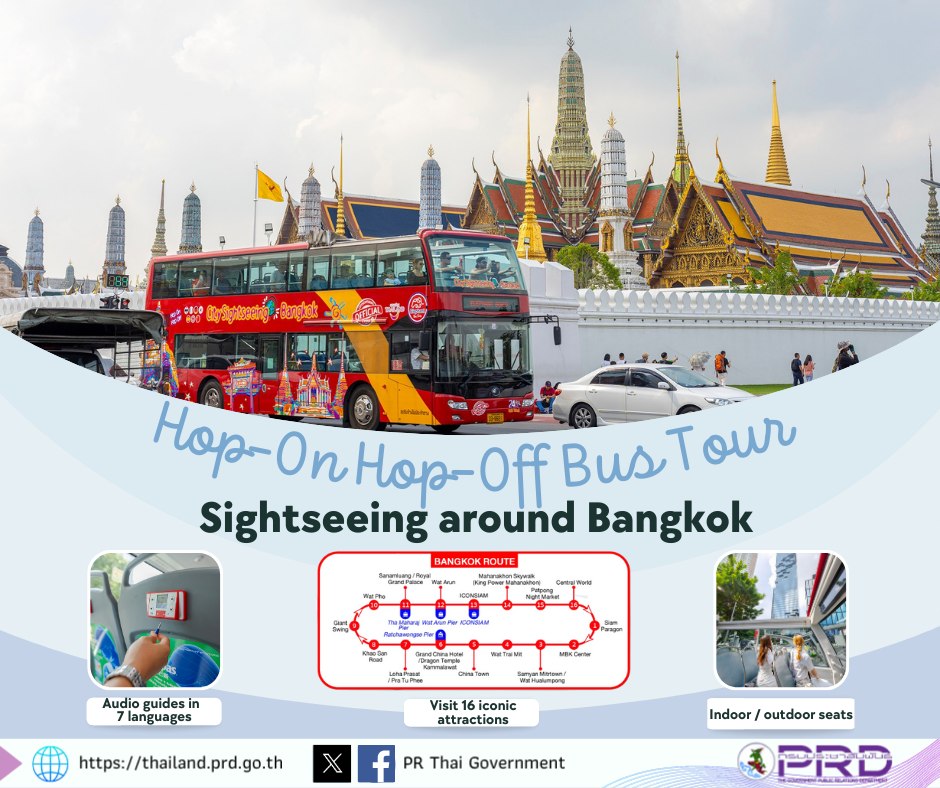태국 관광청은 승하차 자유 2층 버스 투어에 방콕을 관광하는 여행자를 초대하고 있다.