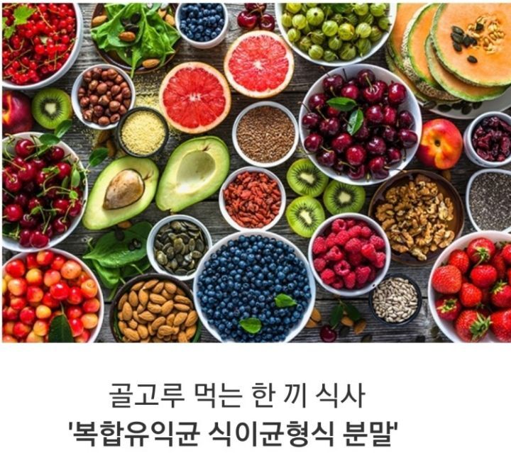 골고루 먹는 한 끼 식사 '복합유익균 식이균형식 분말' 속에 채소, 과일, 곡류, 견과, 버섯, 콩류, 야채, 산야초 등 천연식품 50가지를 발효한 발효 식이섬유소 영양균형식과 복합유익균(마이크로바이옴:Microbiome) 등 79가지 함유돼있어요