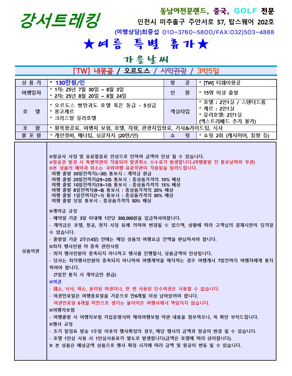중국에 내몽골 초원 사막 오르도스 4박 6일 이었습니다. 답사를 잘 갔다 와서 8월 20 날 3박 5일로 갈 계획입니다. 벌써 18명 작성자최중섭|작성시간25.07.24|조회수41 목록 댓글 0 글자크기 작게가 글자크기 크게가 많이 신청해 주시면 감사하겠습니다. 다음검색 현재 게시글 추가 기능 열기 북마크 공유하기 신고 센터로 신고 댓글 댓글 0 댓글쓰기 답글쓰기 댓글 리스트
