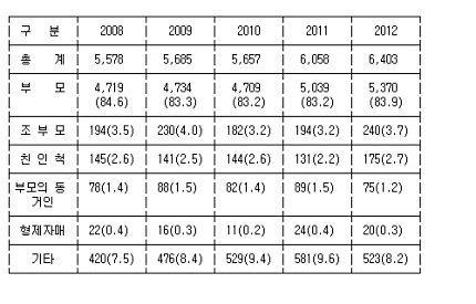 신고 후에도 14% 재학대…부모 대상 양육교육 지원 추진(서울=연합뉴스) 신호경 기자 = 우리나라에서 한 해 발생하는 아동학대 사례 10건 중 8~9건은 집에서, 부모가 저지르는 것으로 조사됐다.이에 따라 정부는 프로그램이나 비용 지원을 통해 부모가 올바른 양육방법을 교육받을 수 있도록 유도할 방침이다.3일 보건복지부가 공개한 '2012년 전국 아동학대 현황' 보고서를 보면 지난해 아동보호전문기관에 들어온 아동학대 신고는 모두 1만943건으로 1년 전보다 7.9% 늘었다. 신고 사례 가운데 현장조사 등을 통해 아동학대로 최종 판단된 경우는 6천403건으로 집계됐다.발생 장소의 대부분(87%)은 '가정'이었고, 학대자의 83.8%는 '부모'였다. 특히 한부모 가정(부자·모자 가정, 미혼부·모 가정)에서 발생한 아동학대가 전체의 40%나 차지했다.어린이집(2.1%), 복지시설(2.0%) 등 집 밖 다른 장소에서의 아동학대 사례는 상대적으로 많지 않았다.학대 유형별로는 여러 가지 종류의 학대가 뒤섞인 중복학대(47.1%)가 가장 흔했다. 이어 방임(26.8%), 정서 학대(14.6%), 신체 학대(7.2%), 성적 학대(4.3%) 등의 순이었다.또 아동학대 중 14.3%는 첫 번째 신고로 개입한 아동보호전문기관이 조처하고 다시 신고가 들어와 아동학대로 재판정 받은 경우였다. 재학대의 78.3%가 처음 조처한 시점을 기준으로 1년 이후에 발생한 것으로 나타났다. 학대자나 학대 피해아동에 대한 보다 장기적 관리가 필요하다는 뜻이다.복지부는 이처럼 심각한?아동 학대?문제를 개선하고자 아동복지법을 개정하고 아동학대 방지 및 처벌 등에 관한 특례법 제정을 추진하고 있다. 두 법안은 지난달 21일 국회 보건복지위를 통과해 현재 국회 법제사법위원회에서 심사를 받고 있다.아동복지법 개정안은 부모가 건강하고 안전한 양육방법을 교육받도록 정부가 지원할 수 있는 법적 근거, 피해아동의 원활한 취학·사생활 보호를 위한 규정 등을 담고 있다.아울러 아동학대 범죄로 형 또는 치료감호를 선고받은 사람은 집행 종료·면제·유예된 날로부터 10년 동안 아동관련 기관 운영은 물론 취업을 제한하는 내용도 들어 있다.아동학대 특례법은 학대행위 보호자 처벌 강화, 어린이집 및 아동복지지설 종사자 아동학대 때 가중 처벌, 접근금지·통신제한·친권제한 등 피해아동 보호 명령제 도입을 명시하고 있다.< 아동학대 행위자별 비중(2008~2012년) > (단위: 건, %)