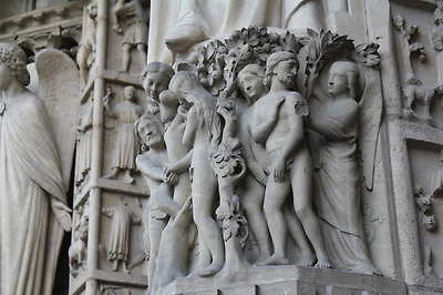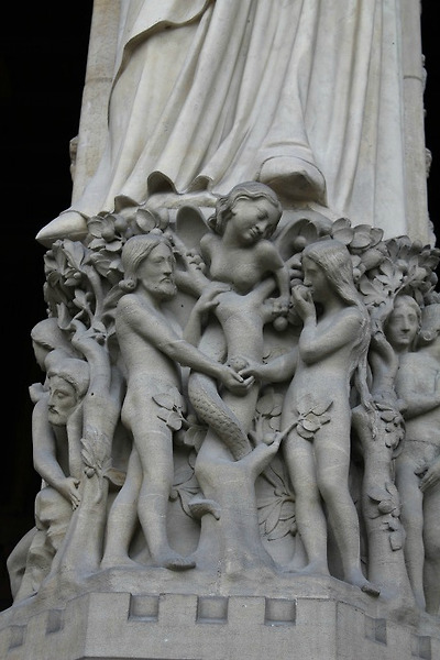 중앙의 석상 발 밑에는 아담과 하와로 추정되는 남녀 한쌍이 애틋하게 손을 마주잡고 있다.