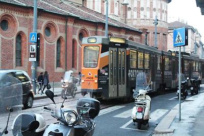 교회 옆을 지나가는 트램.