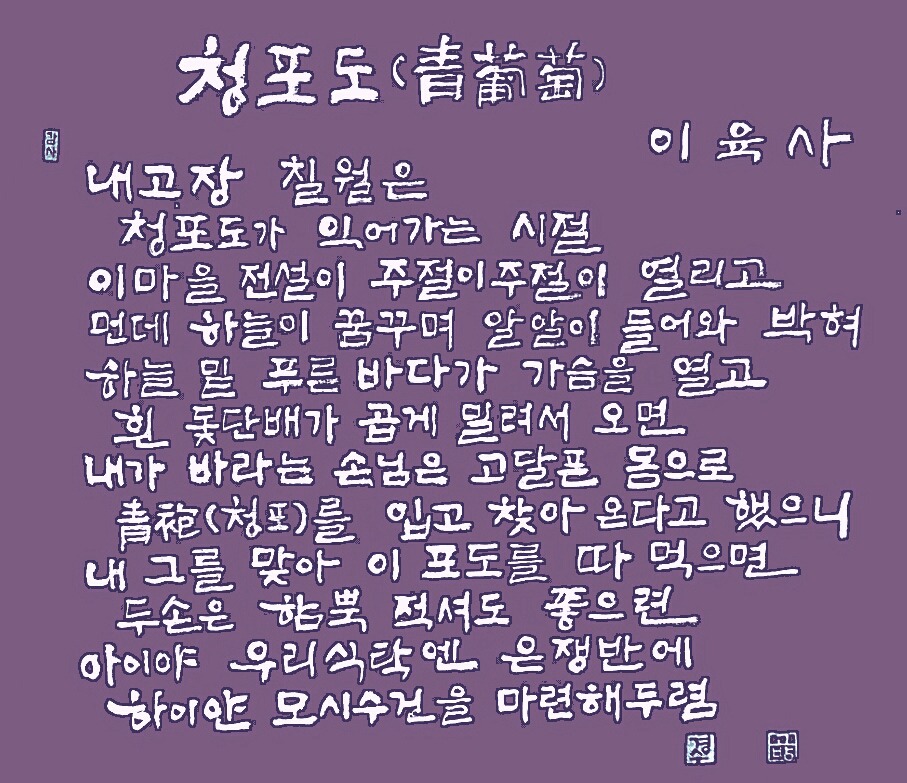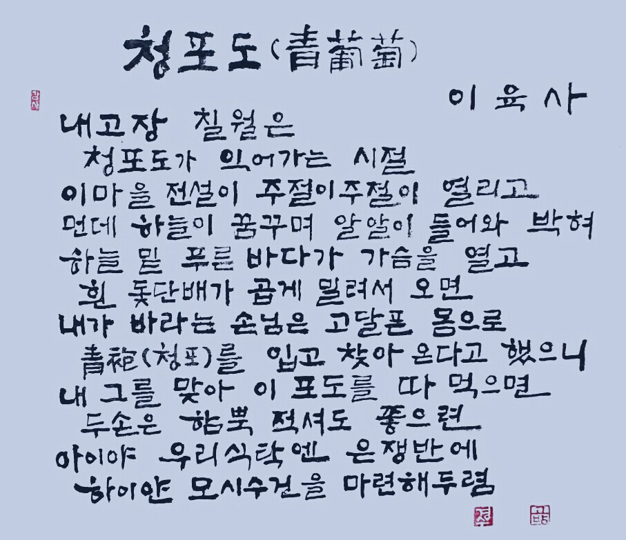 청포를 입고 찾아온다고 했으니 - 청포 : 희망과 풍요로움의 이미지를 푸른색으로 표현