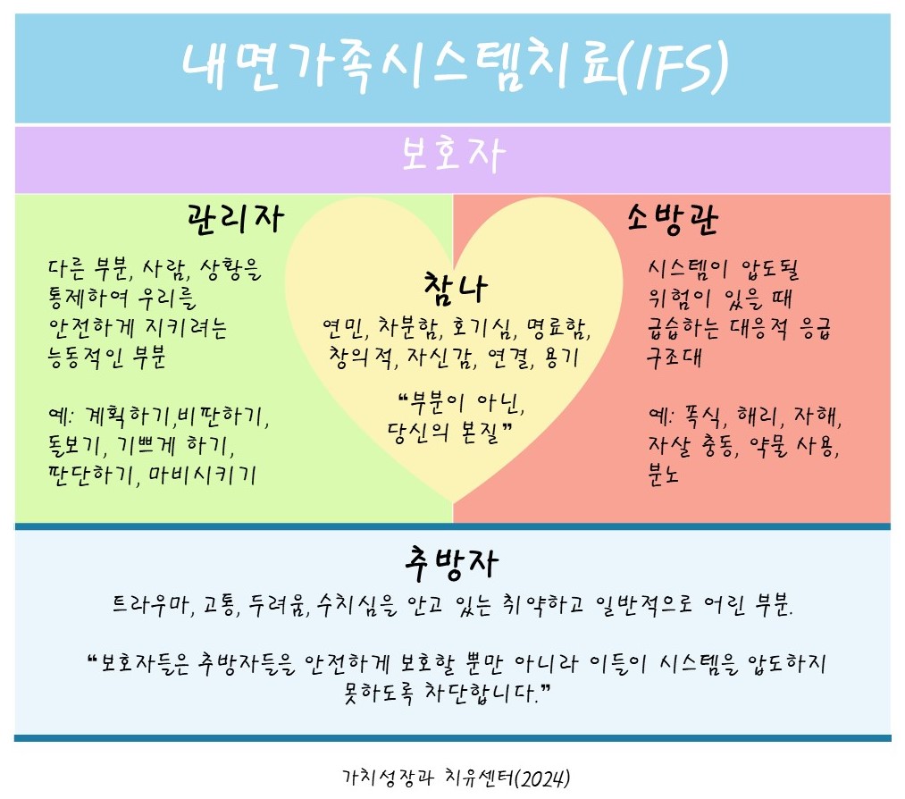 - 상담이 끝난 후에도 내담자 스스로 자신을 돌볼 수 있는 역량을 키우는 것이 IFS치료의 주된 목표입니다.