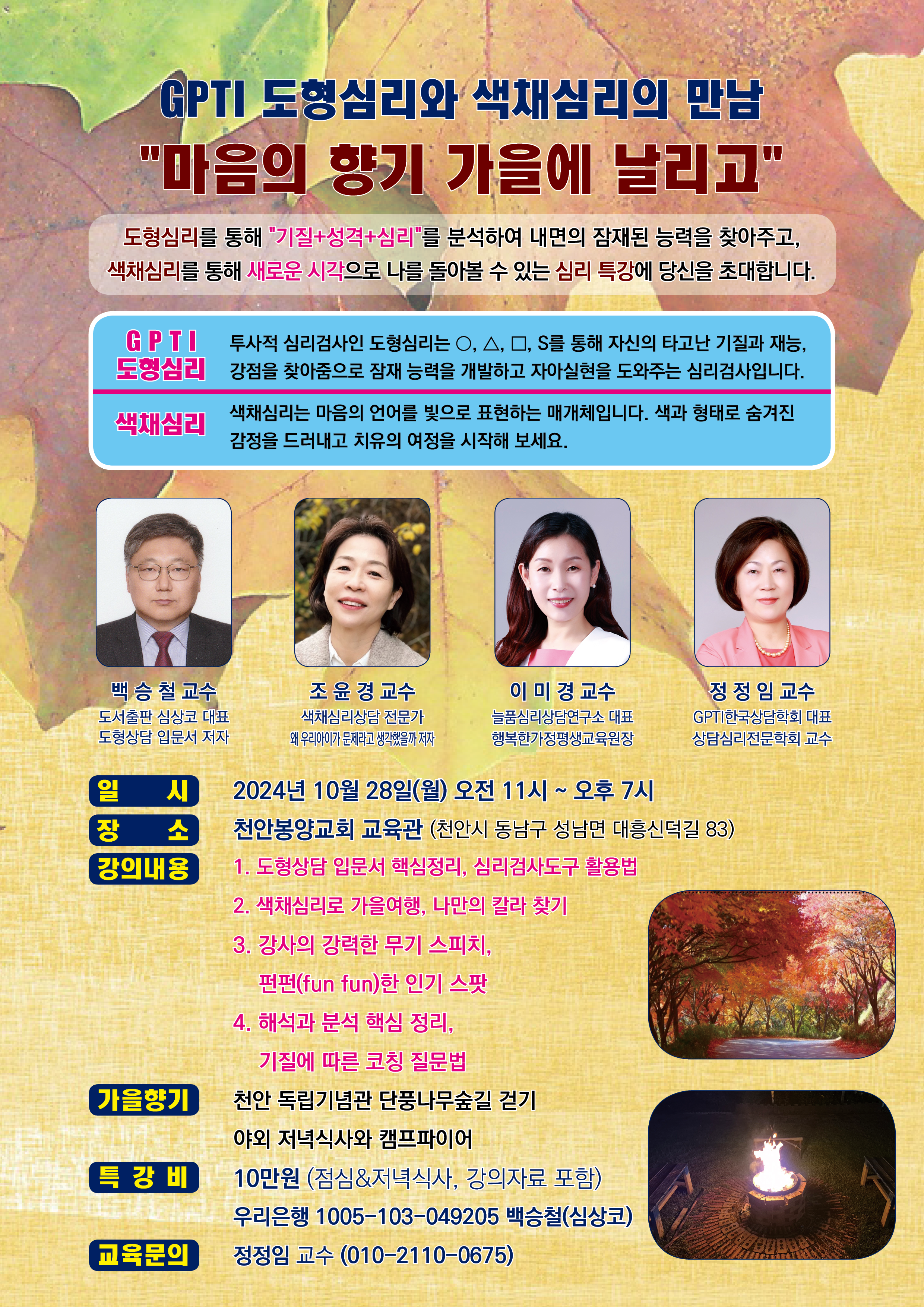 GPTI도형심리와 색채심리 특강 (10월) 작성자한양플러스|작성시간24.10.18|조회수44 목록 댓글 0 글자크기 작게가 글자크기 크게가 다음검색 현재 게시글 추가 기능 열기 북마크 공유하기 신고 센터로 신고 댓글 댓글 0 댓글쓰기 답글쓰기 댓글 리스트