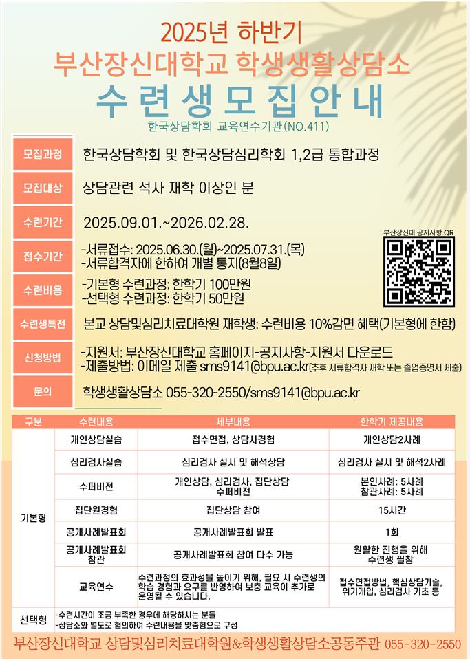 2025년 하반기 부산장신대학교 상담수련생(2기) 모집(양학회 인정) 작성자색연필|작성시간25.07.18|조회수12 목록 댓글 0 글자크기 작게가 글자크기 크게가 다음검색 현재 게시글 추가 기능 열기 북마크 공유하기 신고 센터로 신고 댓글 댓글 0 댓글쓰기 답글쓰기 댓글 리스트