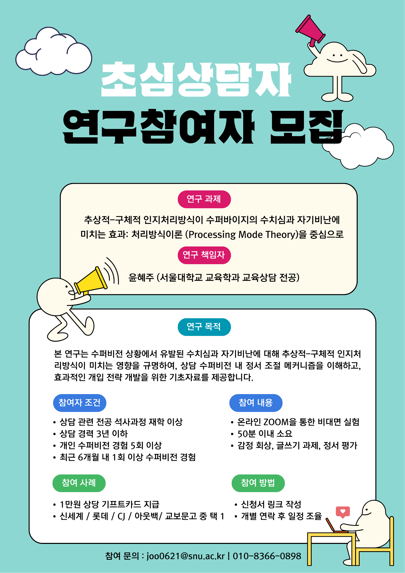 안녕하세요. 서울대학교 교육학과 교육상담 전공 석사과정 윤혜주입니다. 현재 석사학위 논문 연구를 위해 상담 수퍼비전 관련 실험 연구 참여자를 모집합니다. 본 연구는 상담 수퍼비전 상황에서 유발된 수치심이 추상적·구체적 인지처리방식에 따라 어떻게 달라지는지 살펴보는 연구입니다.