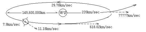 (지구의 자전속도는 약 0.5km/sec이나 인공위성이 지구를 원운동하는데는 7.9km/sec가 필요하고 그 보다 빠르면 타원운동을 하다가 11.18km/sec를 넘어서면 우주로 탈출한다. 반면에 지구가 태양주위를 공전하는데는 29.78km/sec이지만 우주로 탈출하려면 618.02km/sec를 넘어야하며, 태양은 은하계를 220km/sec로 운행하고 있다.)