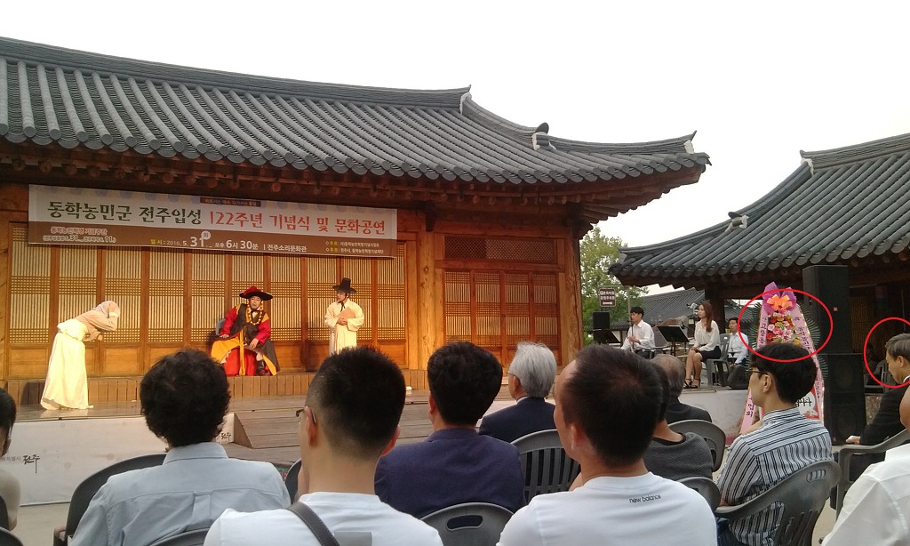 오른쪽 빨간 동그라미 화환은 고창 동학에서 보내신 화환. 맨 오른쪽 동그라미 안은 전주시장 김승수님
