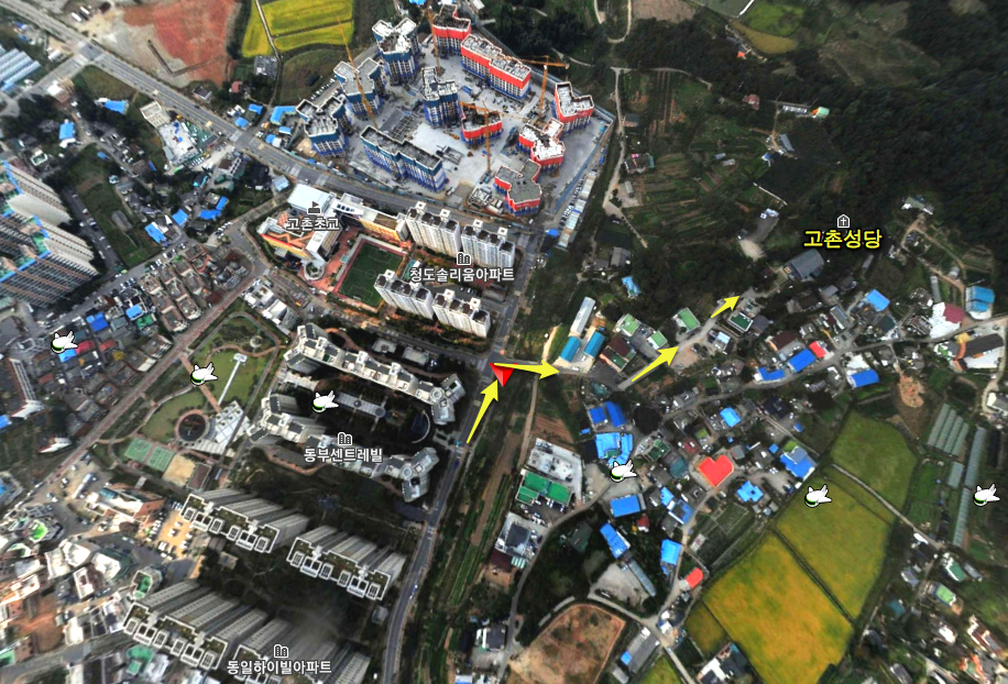 200m 정도 지나 청도 솔리움 아파트가 보이면 오른쪽 작은 다리로 우회전 합니다.