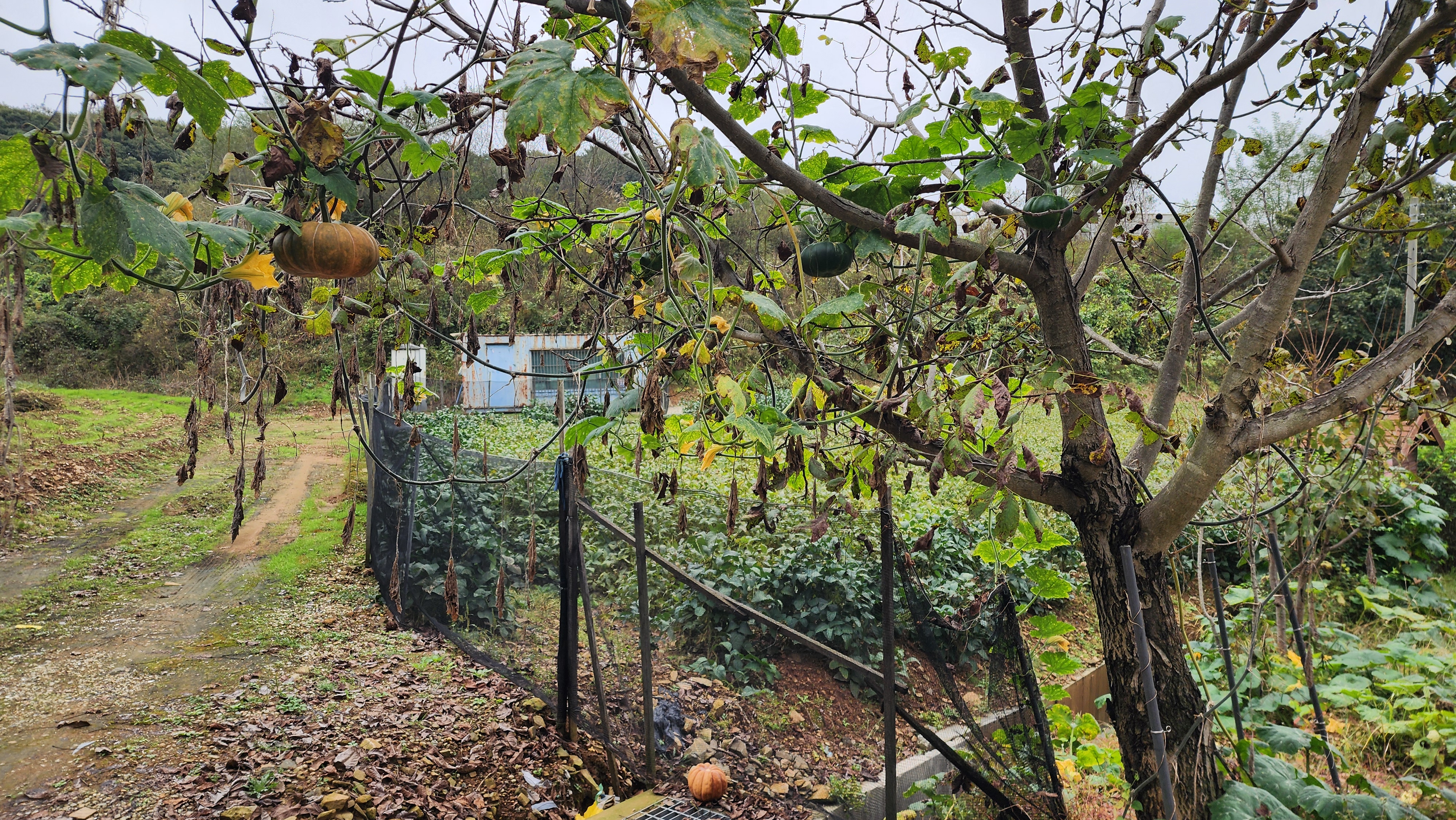 호두나무에 메달린 호박이 썩어 떨어지기도 하고~