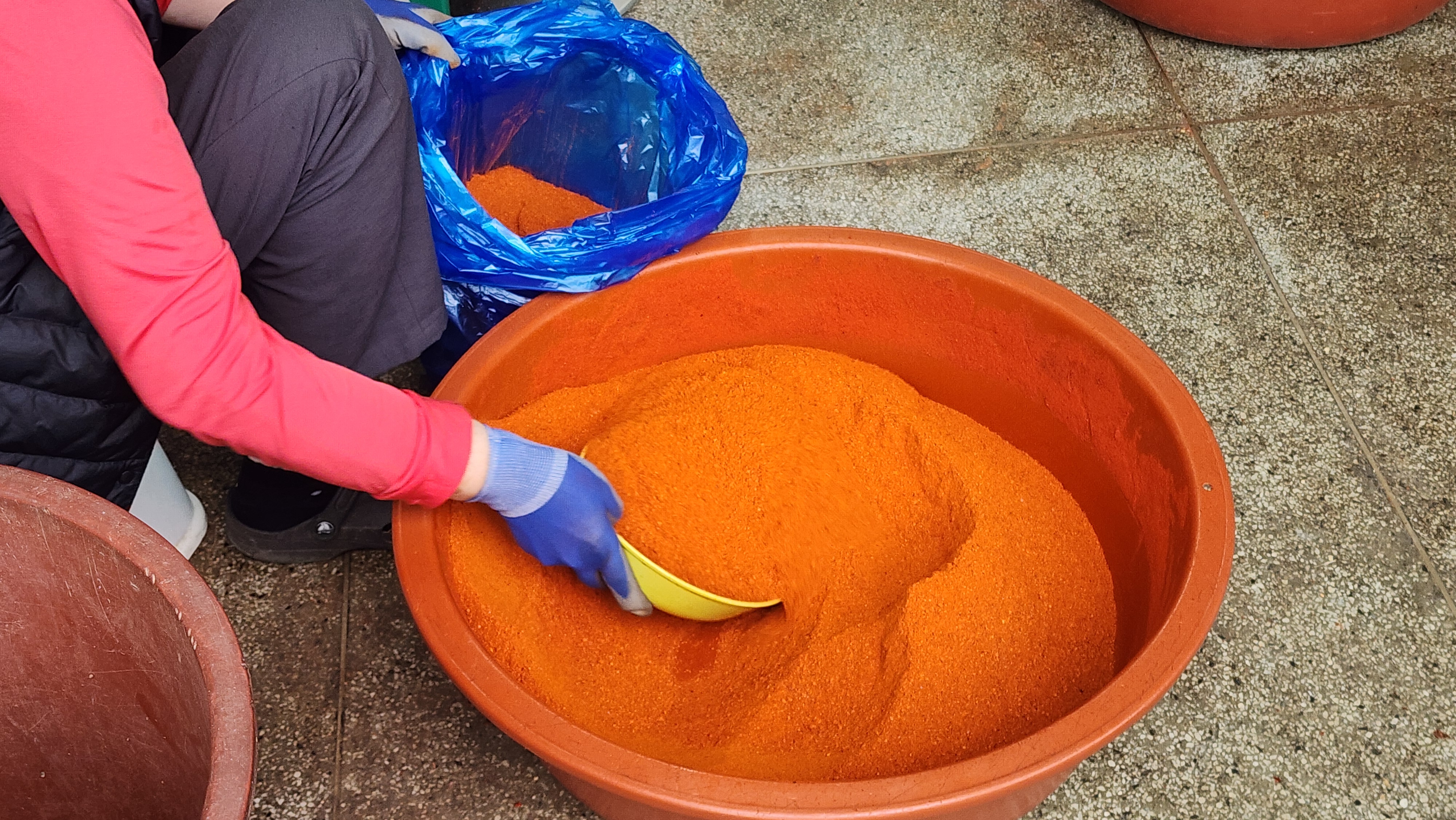 아무리 땟깔이 좋은 고추라도 고춧가루 낼 때 더 빨갛게 하기 위해선 빠스락거리지 않게 좀 눅눅하게 해서 빻아야 한다고~
