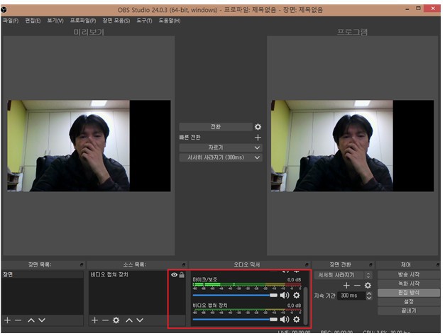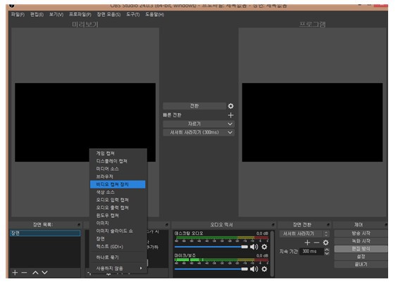 여기서 오디오 믹서부분에서 비디오 캡쳐 장치에 오디오 막대나