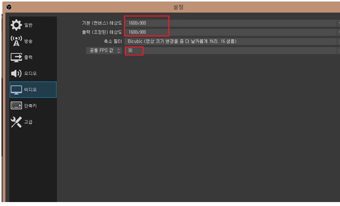 비디오에서 기본해상도 출력해상도 1920X1080로 지정(저는 노트북 성능한계로 1600임)