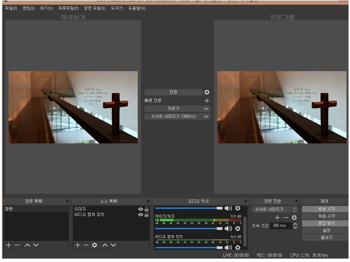 *참고로 편집방식을 클릭하시면 화면이 두 개로 보입니다(왼쪽으로 미리보기 오른쪽은 송출)