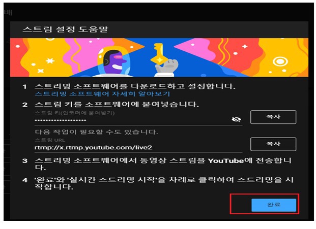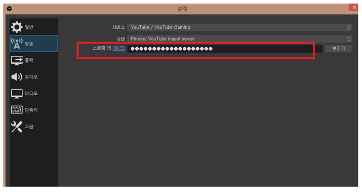 스트림 키 눈금을 클릭하시면 보임-이것을 복사하여 OBS 스튜디오로 설정- 방송으로 가서
