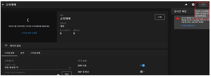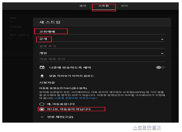 스트림에서 ~ 교회예배(교회에 맞게 입력)- 공개로 선택- 아래 시청자층 아니요에 체크