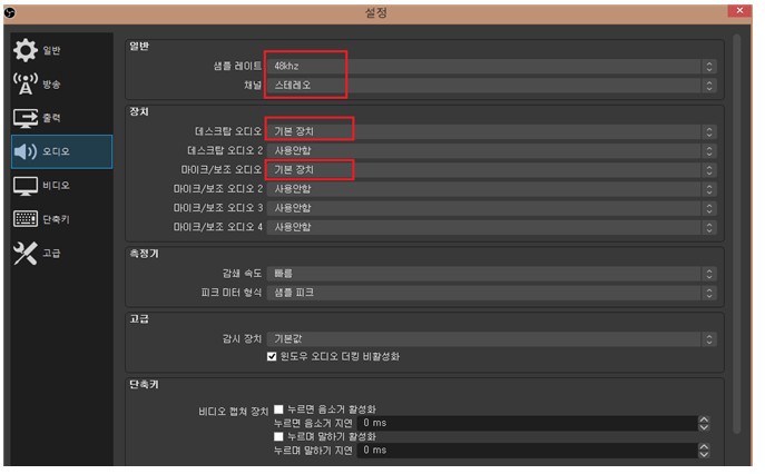 마이크/ 보조 오디오에서 저는 웹캠이라 기본장치