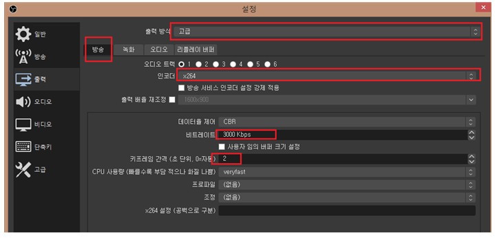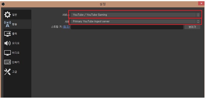 설정- 방송에서 서버는 아래와 같이 선택하시고