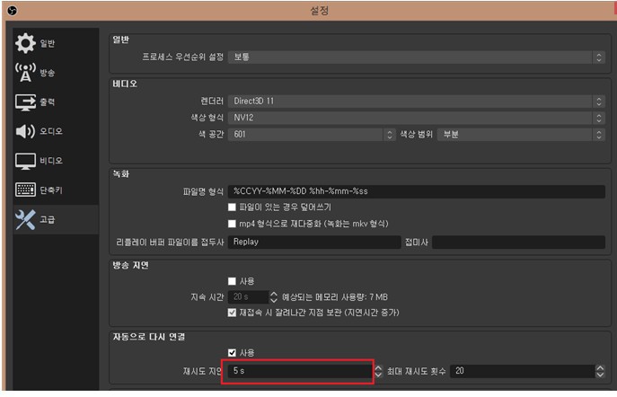고급에서 자동으로 다시연결 5초로 지정하시고 적용 확인