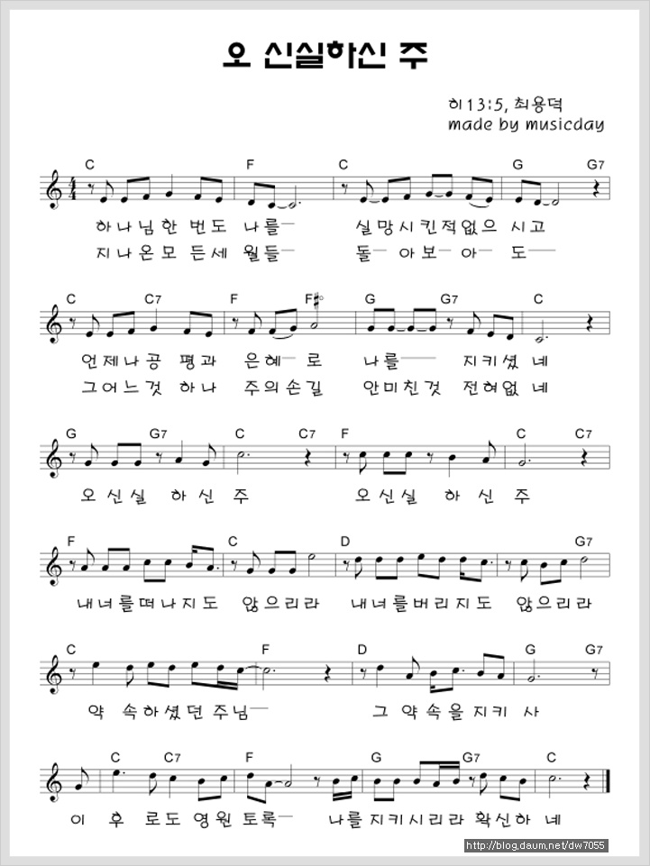 [스크랩] 102. 하나님 한 번도 나를(오 신실하신 주)[찬양*악보*가사] 작성자두나미스(어길진)|작성시간11.09.24|조회수705 목록 댓글 0 글자크기 작게가 글자크기 크게가 하나님 한 번도 나를(오 신실하신 주)[찬양*악보*가사] 하나님 한번도 나를 실망시킨 적 없으시고 언제나 공평과 은혜로 나를 지키셨네오 신실하신 주 오 신실하신 주내 너를 떠나지도 않으리라내 너를 버리지도 않으리라약속하셨던 주님 그 약속을 지키사이 후로도 영원토록 나를 지키시리라 확신하네지나온 모든 세월들돌아보아도 그 어느 것 하나주의 손길 안 미친 것 전혀 없네 다음검색 스크랩 원문 : 춘천 대우인력 김진규 현재 게시글 추가 기능 열기 북마크 공유하기 신고 센터로 신고 댓글 댓글 0 댓글쓰기 답글쓰기 댓글 리스트