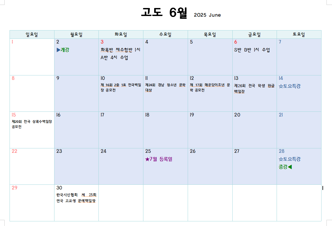 ☛ 고도창작원 6월 달력 작성자유진쌤|작성시간25.05.21|조회수691 목록 댓글 0 글자크기 작게가 글자크기 크게가 6월 공휴일에는 학원 정상적으로 운영하지만 수업 시간에 변동이 있습니다.달력에 표시된 변동 수업 시간 잘 확인하고 등원해주세요~ 다음검색 현재 게시글 추가 기능 열기 북마크 신고 센터로 신고 댓글 댓글 0 댓글쓰기 답글쓰기 댓글 리스트