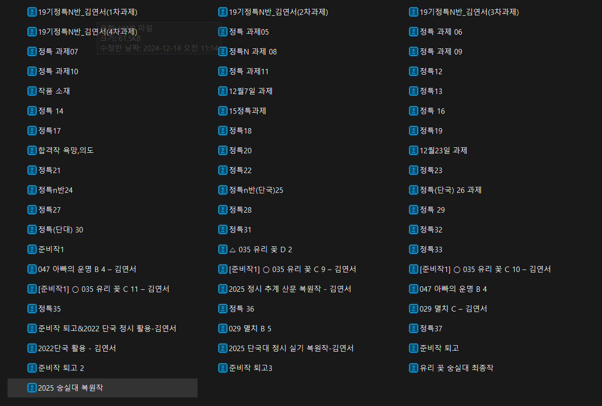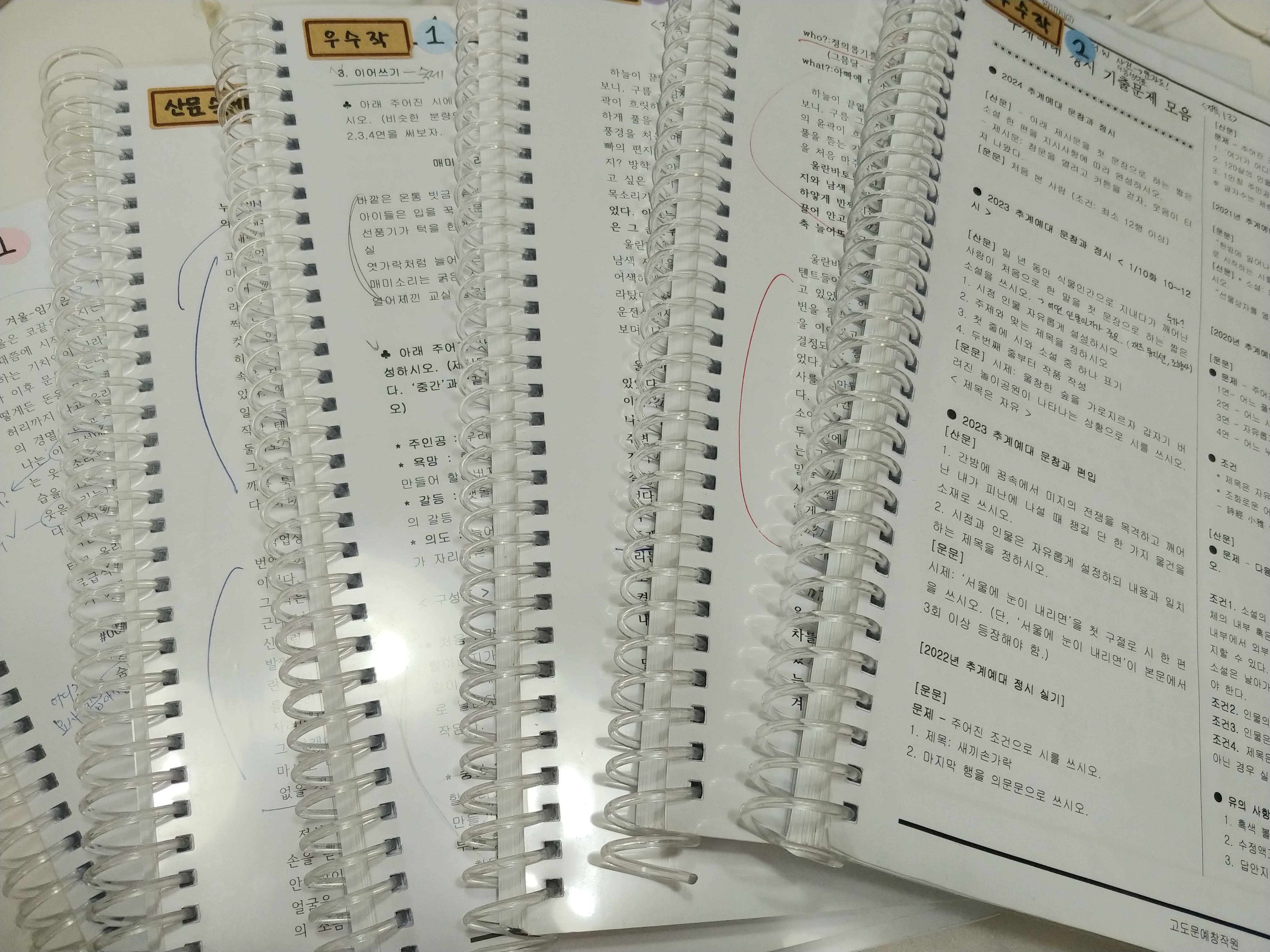 아마 저처럼 정특반을 다니게 되는 친구들은 학원 시스템을 이해하기 힘들 수 있어요. 실기 시험 전까지 계속 글을 쓰지만 준비작을 받기가 쉽지 않기 때문이에요.. 저는 1월 8일까지 세모작이 하나도 없었어서 많이 힘들었어요. (여러분 진짜 세모 못 받더라도 포기하지 말고 계속 고치세요! 이 작품 하나는 세모를 받겠다!! 이런 마음가짐으로 하나만 파면 결국 동그라미까지 받게 되더라고요.) 그리고 진짜 제일 중요한 거는 필사!! 저는 필사를 글 쓰고 나서 해야겠다고 생각했었는데 그렇게 되면 계속 밀리더라고요. 항상 글 쓰기 전에 필사를 가장 먼저 하세요!!(선생님께서 주신 걸 전부 하루 만에 하기는 어려워서 가장 마음에 드는 우수작 2개 정도를 골라서 당일날 필사하고 못한 건 주말에 몰아서 썼어요. 저는 필사를 가장 먼저 시험 보는 학교 2주 전까지 꾸준히 했어요.)