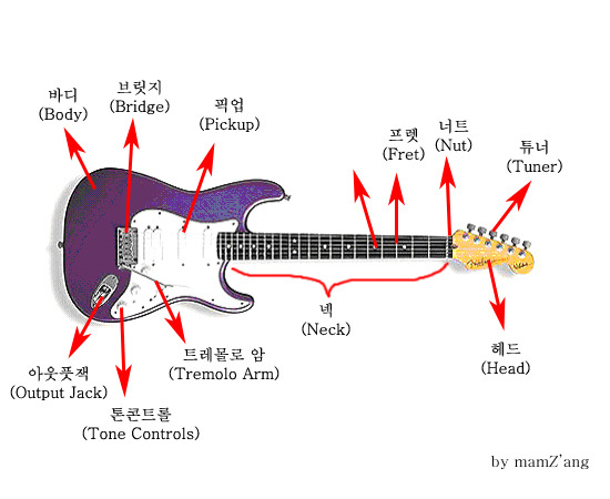 기타의 바디를 보게되면 픽업 , 브릿지 , 암 , 픽업셀렉터 , 노브 , 아웃풋 잭, 픽가드 , 핀으로