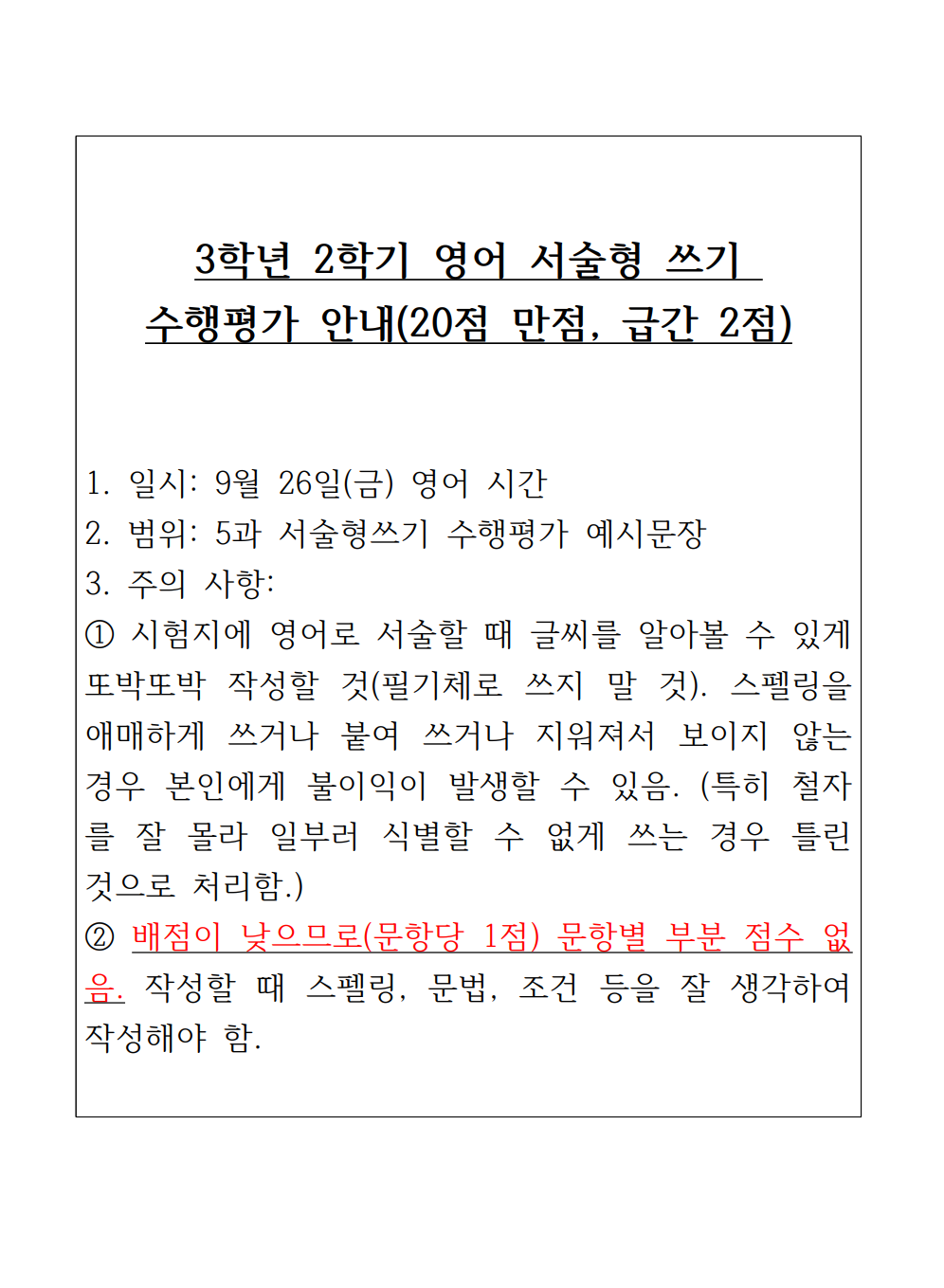 2학기 서술형 쓰기 수행 평가 안내 작성자다람쥐|작성시간25.09.09|조회수35 목록 댓글 0 글자크기 작게가 글자크기 크게가 5단원 서술형쓰기 수행평가 예시문장은 수업시간이나 아침 조회시간을 활용하여 배부하며, 예시 문장들이 어떤 상황에 쓰이는지 이해할 것. 다음검색 현재 게시글 추가 기능 열기 북마크 공유하기 신고 센터로 신고 댓글 댓글 0 댓글쓰기 답글쓰기 댓글 리스트