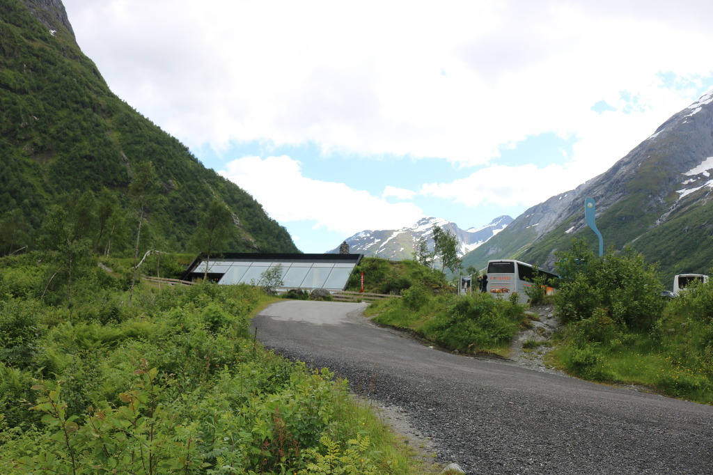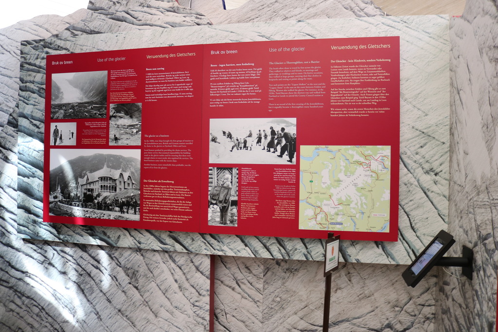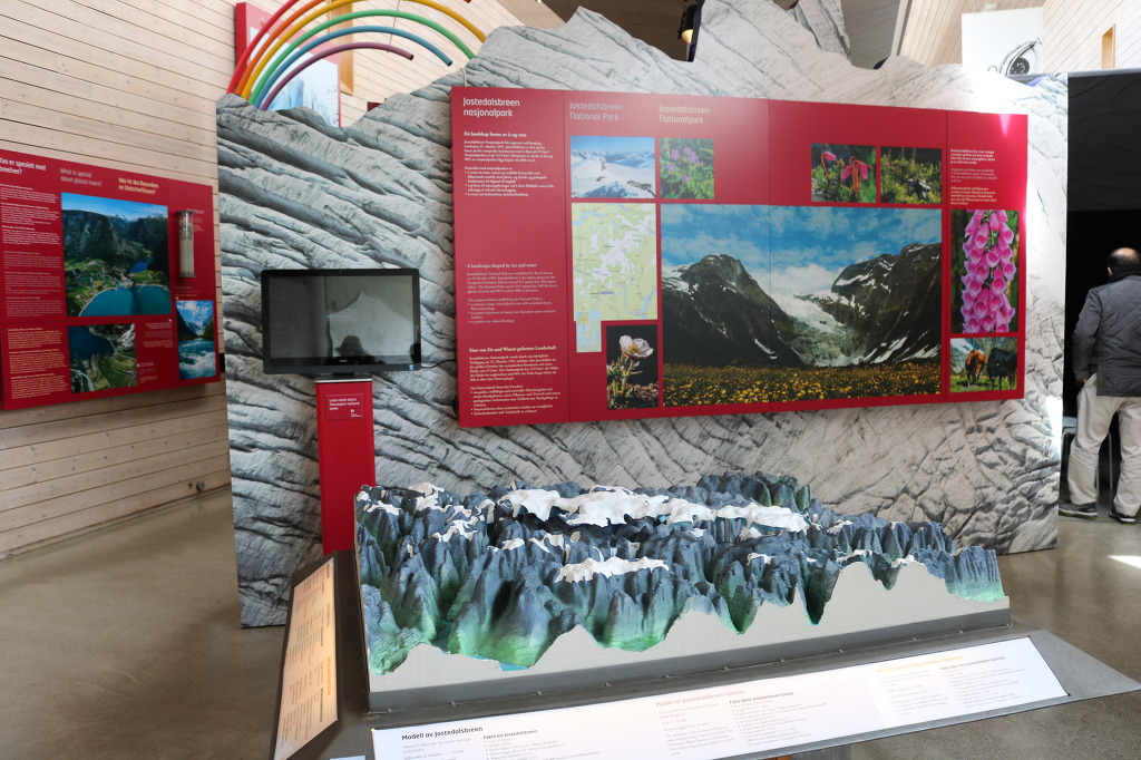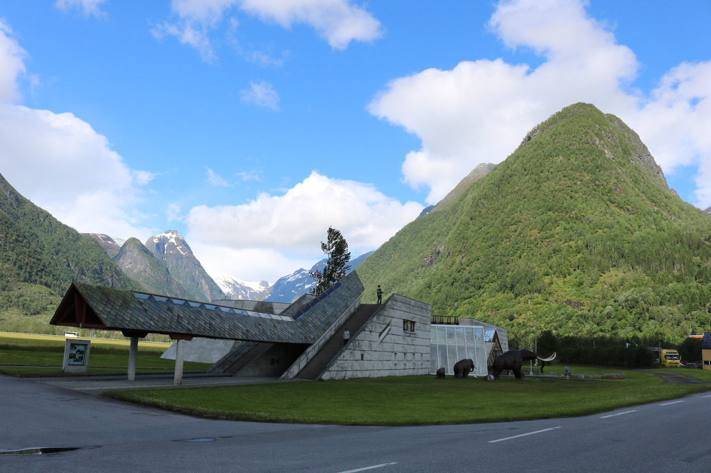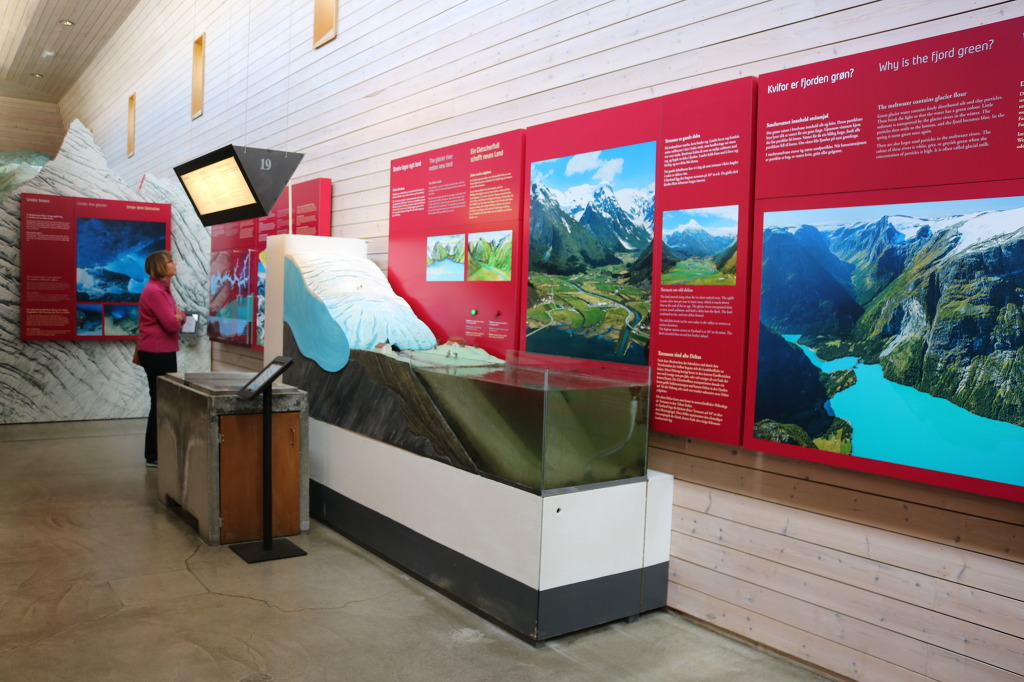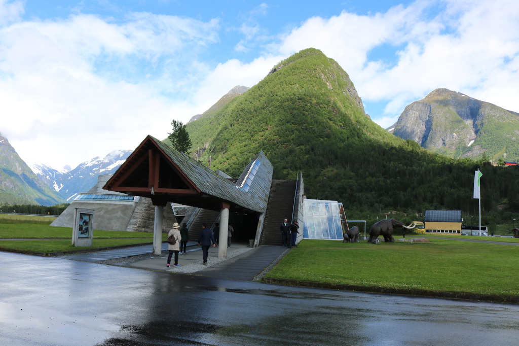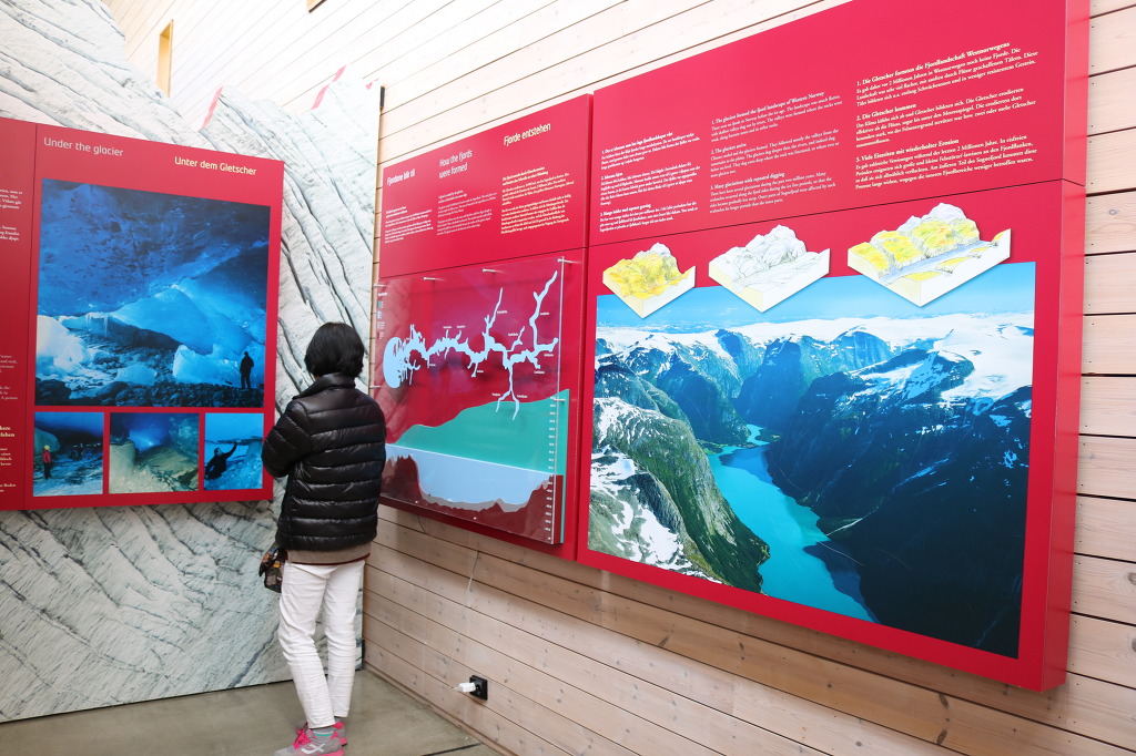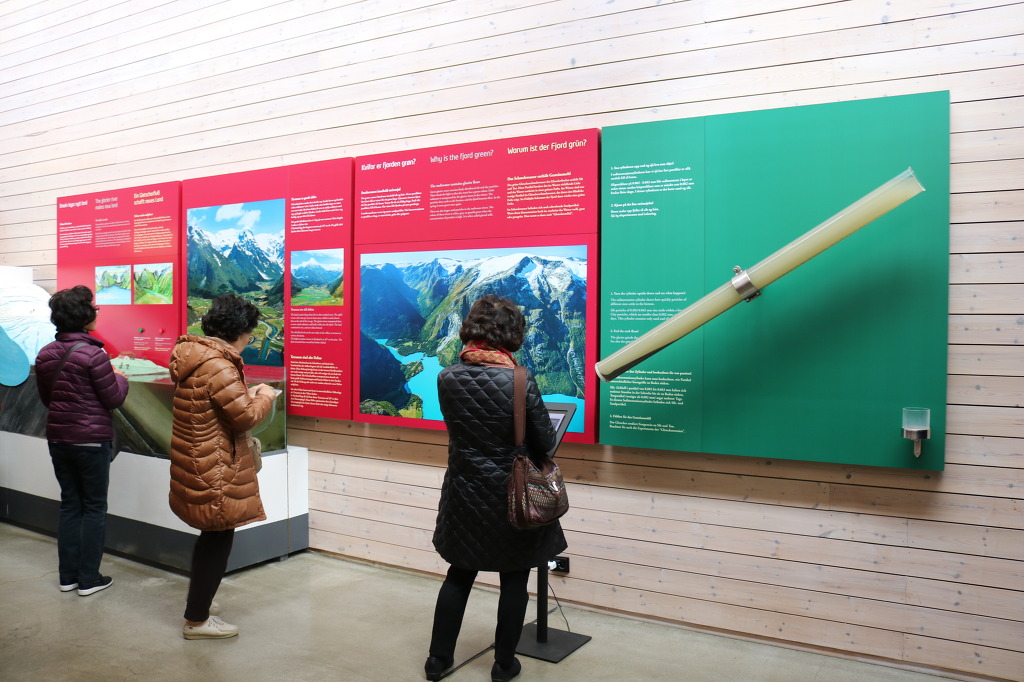 ▼ 얼마간 더 달린 버스는 빙하의 광대한 생성 과정과 역사를 한눈에 볼 수 있는 ‘빙하 박물관(Glacier Museum)’ 앞에다 우릴 내려놓는다. 북유럽의 가장 큰 빙하인 요스테달 빙하 아래의 계곡에 위치하고 있는데, 빙하를 연상시키는 독특한 형태로 설계된 박물관의 외관은 주변 환경과 자연스럽게 동화되고 있는 모양새이다. 노르웨이의 건축가이자 프리츠커상(Pritzker Prize, 건축가의 노벨상으로 불린다)의 수상자(1997)로 유명한 ‘스베레 펜(Sverre Fehn, 1924~)이 설계한 이 박물관은 주 재료로 콘크리트와 유리·목재를 이용하였으며, 기울어진 외벽과 다양한 형태의 창문으로 장식되어 있다. 박물관은 노르웨이의 유명 영화감독 이보 카프리노가 제작한 빙하와 관련된 20분 분량의 영화를 보여주며, 긴 사각형 모양의 직선으로 된 전시관에는 4가지 카테고리(category)에 24개의 테마(Thema)를 가진 다양한 전시물들로 구성되어 있다.