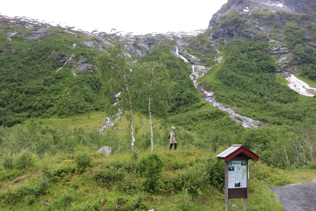 ▼ 주차장에 내리면 암벽으로 이루어진 언덕이 나타난다. 두꺼운 얼음으로 덮여있는 암벽이다. ‘뵈이야빙하(Boyabreen)’라고 하는데 의외이다. 그동안 빙하는 북극 같은 바다에 둥둥 떠 있는 얼음덩어리로만 생각해왔기 때문이다. 하지만 빙하는 크게 대륙빙하와 산악빙하, 그리고 산록빙하로 분류된단다. 그렇다면 뵈이야 빙하는 ‘폭이 좁은 리본 형태로 산 계곡을 흘러내리는 빙류(氷流)’를 뜻하는 산악빙하로 보면 되겠다.