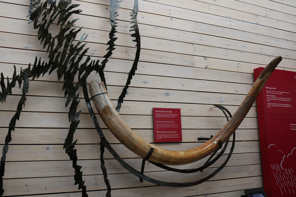 ▼ 매머드(mammoth)의 상아(象牙)도 전시되어 있다. 그들의 현대 후손인 코끼리처럼 매우 컸다고만 알고 있었는데, 상아의 크기로 보아 그보다는 훨씬 더 컸었나 보다. 아무튼 영어로 ’mammoth‘는 ’큰‘ 이나 ’거대한‘ 이라는 뜻으로 이해된다. 지금까지 알려진 매머드 중 가장 큰 것은 ’송화강 매머드‘로, 어깨까지의 높이가 무려 5m에 이른다고 한다. 그러나 대부분의 매머드 종들은 현대 아시아 코끼리와 크기가 유사하단다.