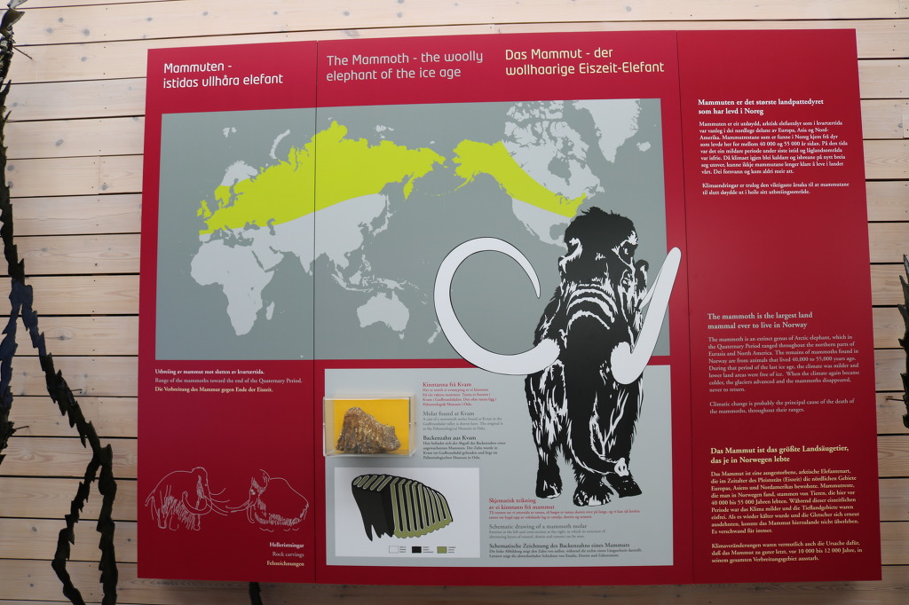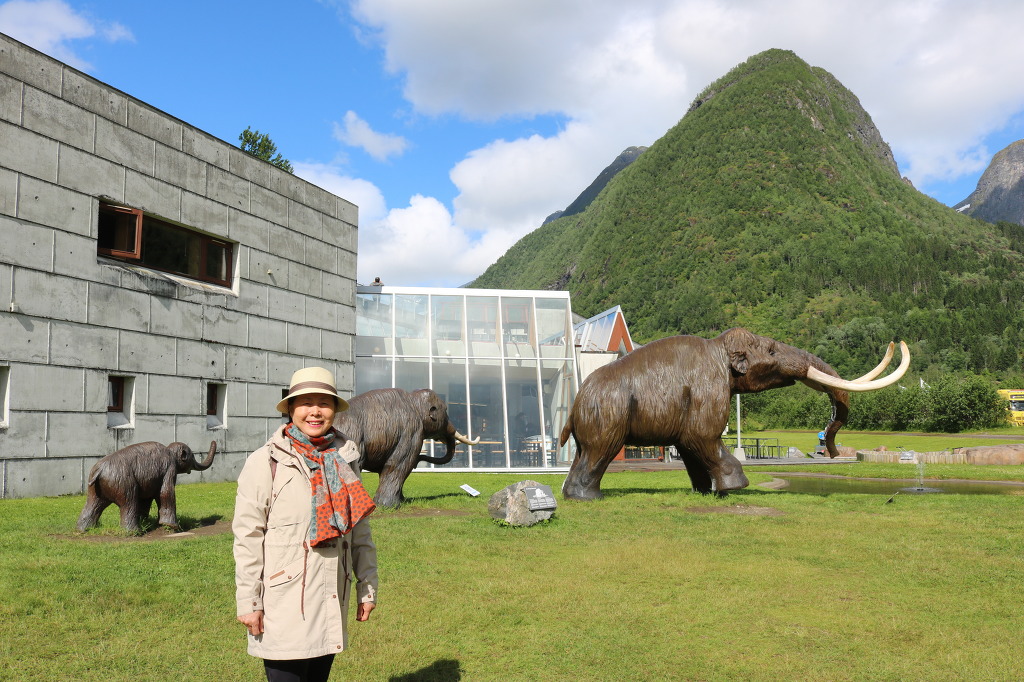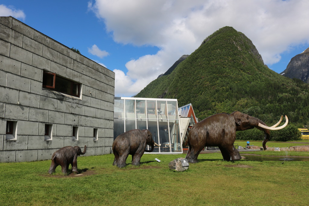 ▼ 박물관의 뜰에는 크기가 각각 다른 매머드(mammoth) 세 마리가 밖으로 걸어 나가고 있다. ’맘모스‘로도 발음되는 이 동물은 포유류 장비목에 속하는 멸종한 동물로, 크게 휜 엄니와 긴 털이 특징이다. 플라이스토세인 480만 년 전부터 4천 년 전까지 존재했다. 영구적인 동토(凍土)에서 보존 상태가 좋은 화석으로 발견되는 게 보통이므로 빙하박물관과 연관시켜 놓은 모양이다.