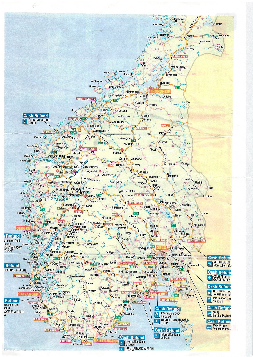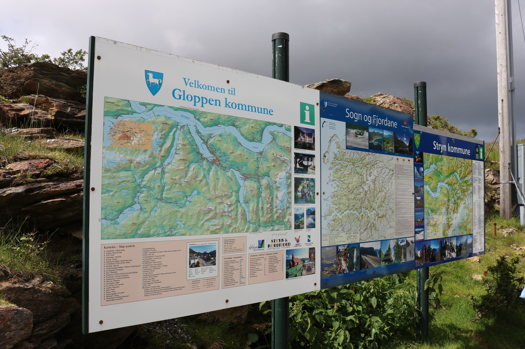 ▼ 안내판에 ‘kommune’이라는 단어가 보인다. 프랑스의 최하위 행정구역인 ‘코뮌(commune)’과 같은 뜻이 아닐까 싶다. ‘공동생활을 함께 나누는 사람들의 작은 모임’이라는 중세 라틴어 ‘communia’에 어원(語源)을 둔다는 그 단어 말이다. 그 앞에는 ‘스트린(Stryn)’이란 단어도 적혀있다. 앗! 이건 아까 점심을 먹었던 마을의 이름이 아닌가. 또 다른 안내판에는 ‘글로펜(Gloppen)’이란 지명이 적혀있다. 그리고 가운데 안내판에는 ‘Sogn og Fjordane’라고 적혀있다. 노르웨이의 ‘송노 피오라네 州(Sogn og Fjordane county, Norway)’를 나타내는 단어일 것이다. 이로보아 ‘노드 피오르드(Nord Fjord)’를 끼고 있는 ‘송노피오라네 주’에 대한 관광안내를 기본으로 깔고, 양 옆에다 이 근처에 위치하고 있는 소규모 지방자치단체인 스트린과 글로펜에 소재하고 있는 관광명소들을 표시해 놓은 안내판들인 모양이다.