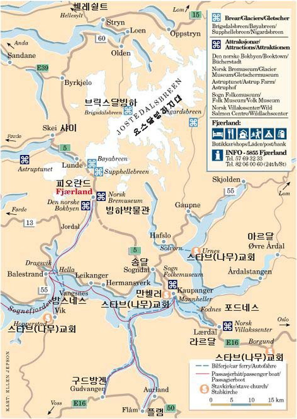 특징 : 노르웨이는 6개월 이상이 얼어붙는 동토(凍土)의 나라이다. 그러니 만년설(萬年雪)과 빙하(氷河)는 노르웨이 사람들에게는 일상이나 마찬가지이다. 이는 노르웨이 관광에서 이 둘을 빼놓을 경우 남는 것이 거의 없을 거라는 얘기이다. 현재 관광객들이 가장 많이 찾고 있는 피오르드 또한 이 빙하가 만들어 놓은 결과물일 따름이다 오늘은 빙하를 직접 보고 느낄 수 있는 코스로 짜여있다. 세계에서 가장 크고 오래된 빙원(氷原)을 자랑하는 ‘푸른 빙하’, 즉 요스테달 빙원의 한 자락인 ‘뵈이야 빙하(Boyabreen)’를 둘러보는 한편, 빙하의 총체적인 모습을 한군데에 모아놓은 ’피얼란드 빙하박물관‘에도 들른다. 공식 명칭이 ’노르웨이 빙하 박물관 겸 울티베이 모에 기후센터(Norsk Bremuseum & Ulltveit-Moes senter for klimaforst?ing)‘인 박물관에서는 피오르드가 어떻게 만들어졌는가를 배울 수 있으며 요스테달빙원에 대한 20분짜리 멀티스크린 동영상 감상도 할 수 있다. 또한 천 년된 얼음 만져보기, 가짜 얼음을 뚫어 만든 터널 지나보기 등의 체험도 가능하다. 특히 1919년에 발견되었다는 얼음인간 '외치(Oetzi)'는 압권이라 할 수 있다.