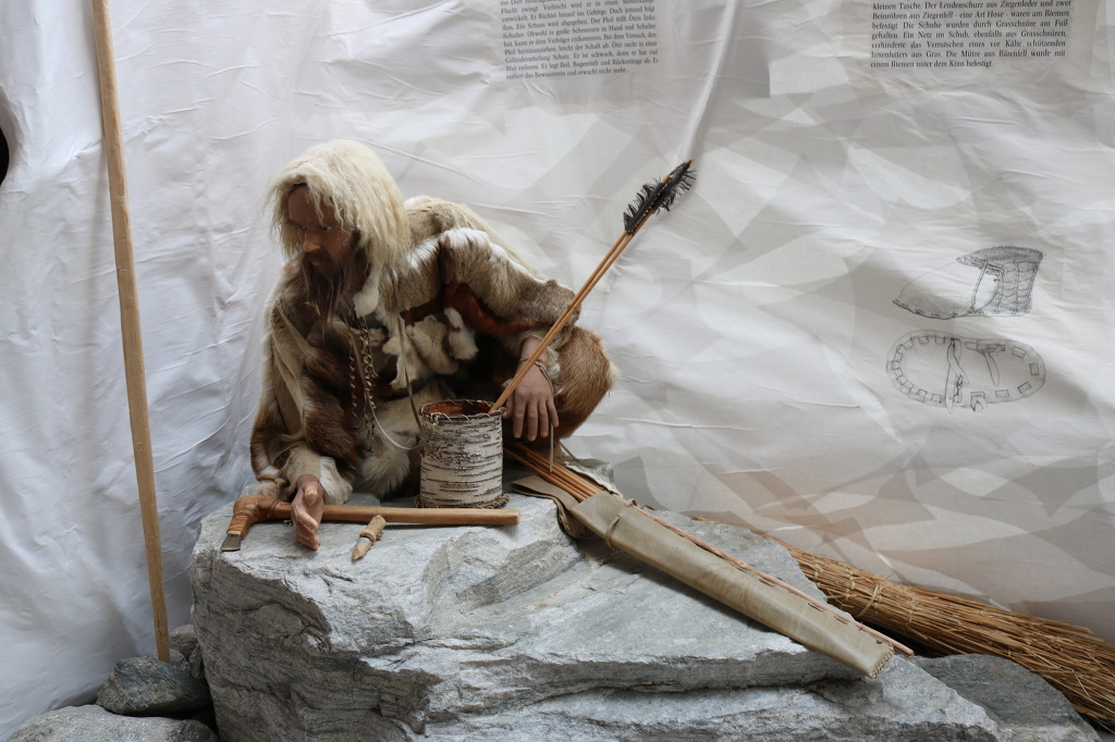 ▼ 1991년 알프스의 빙하에서 발견되었다는 ’얼음인간 외치(Oetzi The Ice Man)‘도 살아 있을 때의 모습으로 복원해 놓았다. 피나일봉 등반을 마치고 하산하던 독일인 등반가 ’헬무트 지몬‘과 그의 아내 ’에리카‘는 해발 3,200m 부근의 외치계곡 빙하지대에서 얼음 위로 상반신이 드러난 사체를 발견하게 된다. 산행 중 조난당한 사체로 오해했을 정도로 사체의 상태는 그리 오래되어 보이지 않았다. 하지만 냉동 미이라 곁에서 현대인의 것이라고는 볼 수 없는 유물들이 함께 발견되면서 뼈와 피부로 연대를 측정한 결과 5300년 전의 석기시대 인간으로 밝혀졌다. 또 미라의 뼈와 근육에서 DNA를 뽑아내 분석한 결과 유럽인의 조상으로 판명 되었다. ’아이스맨 외치(Oetzi The Ice Man)‘란 이름은 그가 발견되었던 지역의 이름(Oetzi)을 딴 것이다. 이와 관련된 기록들을 따로 적어 뒤에다 걸어 놓았다.