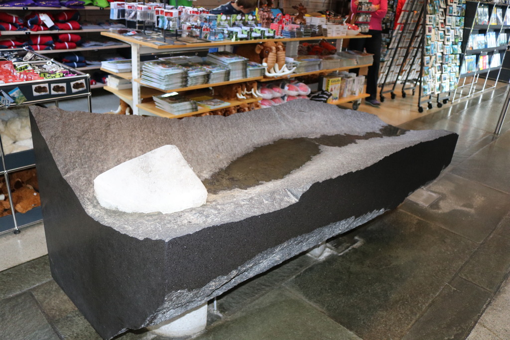 ▼ 숍의 앞에는 1,000년 된 빙하가 샘플로 놓여있다. 진품이다 보니 얼음 녹은 물이 둥그런 돌바닥을 따라 흘러내린다. 빙하가 녹으면서 계곡을 만들어내는 과정을 설명하려는 의도인 모양이다. 거기다 빙하를 손으로 직접 만져보라는 배려를 추가했을 것이고 말이다. 하지만 녹아 없어진 후에는 새로운 것으로 갈아 놓아야 할 테니 꽤나 번거로운 일일 게 분명하다.