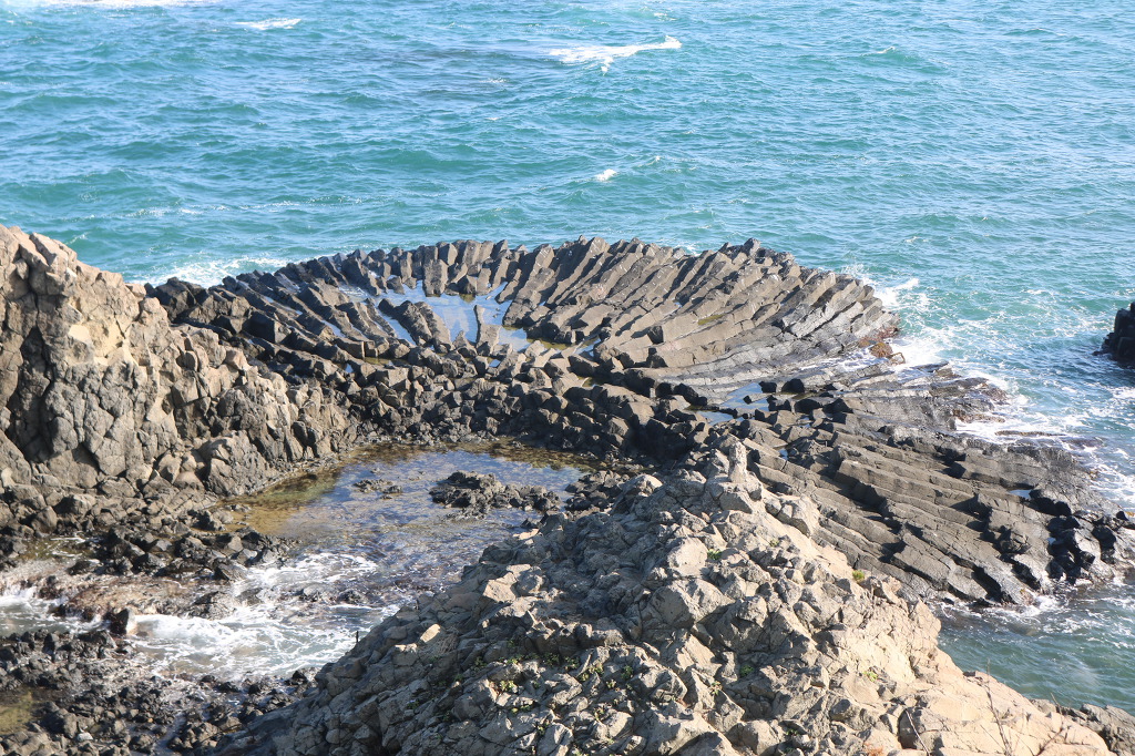 ▼ ‘부채꼴 주상절리’는 이곳 양남 주상절리의 꽃이라 할 수 있다. 길이 10m가 넘는 주상절리가 부채꼴 모양으로 펼쳐져 있는데, 그 모습이 마치 바다 위에 곱게 핀 해국 같다고 하여 ‘동해의 꽃’이라고도 부른다. 국내에서는 최초로 발견되었고, 세계적으로도 희귀하단다. 참고로 경사진 주상절리는 경사면을 따라 내려가다 굳어진 것이지만 부채꼴 주상절리는 어떻게 형성됐는지 아직 규명되지 않고 있단다. 두 가지 설이 있는데 첫 번째는 마그마가 올라오던 분화구였을 것이라는 설이다. 지하에서 용암이 올라오다 식으면서 방사성 모양으로 굳어졌다는 것이다. 두 번째 가설은 둥근 연못으로 용암이 흘러들어 식으면서 방사성 모양이 됐을 것이라는 설이다.