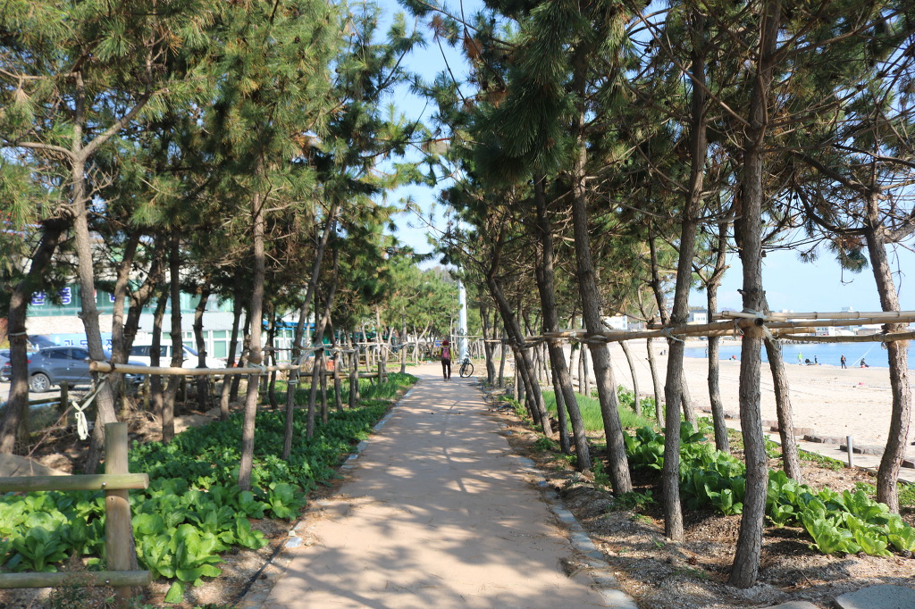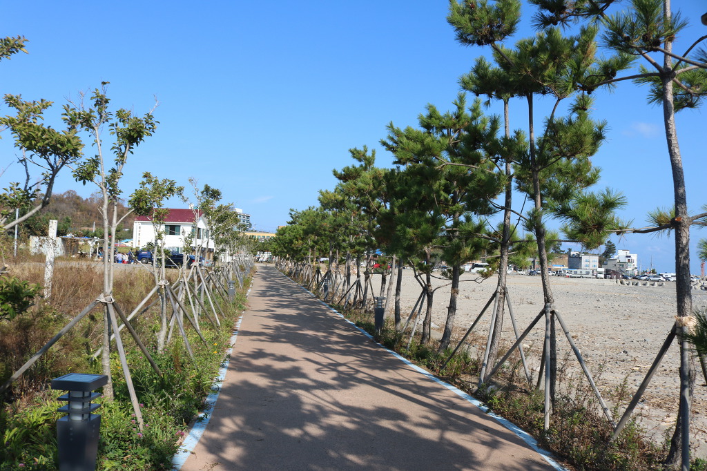 ▼ 탐방로는 다리를 건너서도 해안가를 따른다. 아직까지도 지주목(支柱木)에 의지해서 서있을 정도로 이식한지 얼마 되지 않은 소나들이 가로수 삼아 길게 늘어서있어 조금은 삭막한 풍경이다. 아무튼 아직도 우린 ‘하서리’를 벗어나지 못했다. ‘1리’에서 ‘4리’로 단위부락만 바뀌었을 따름이다. 오른편에 펼쳐지는 해안의 이름 또한 ‘하서’일 것은 당연한 일이라 하겠다.
