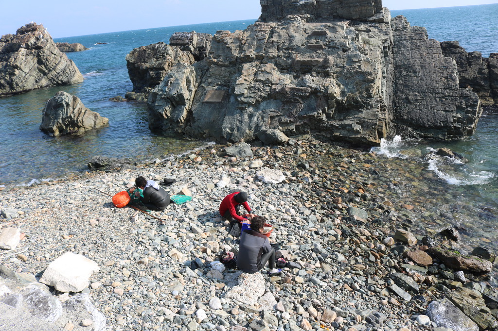 ▼ 바위가 널린 천혜의 바닷가를 그냥 내버려둘 리가 없다. 바닷가에 ’전복양식‘이라는 안내판이 세워져 있는가 싶더니 물질을 준비하고 있는 해녀들도 보인다.