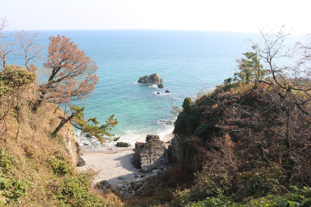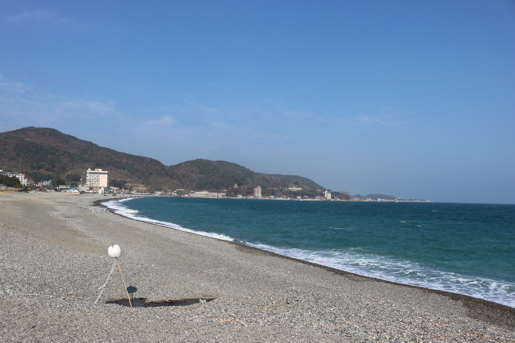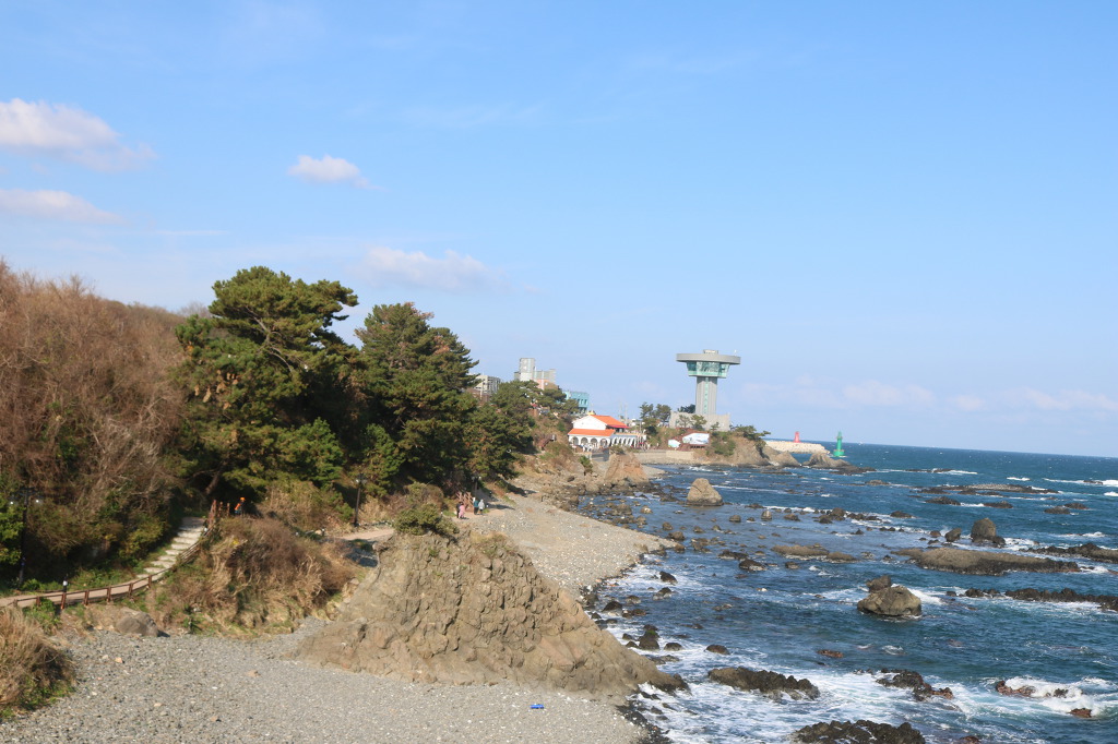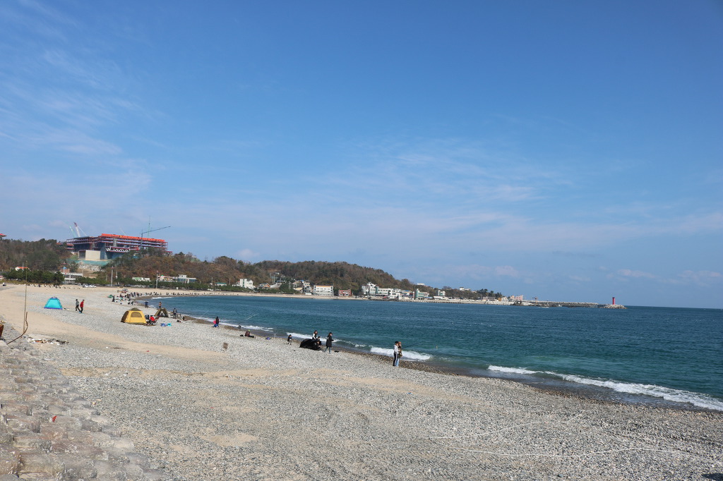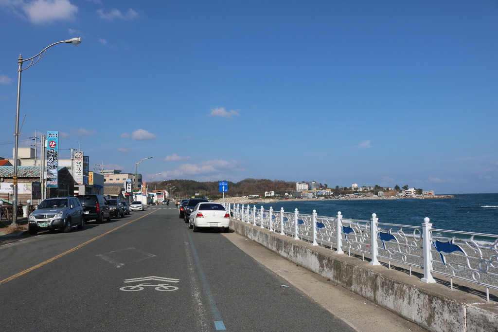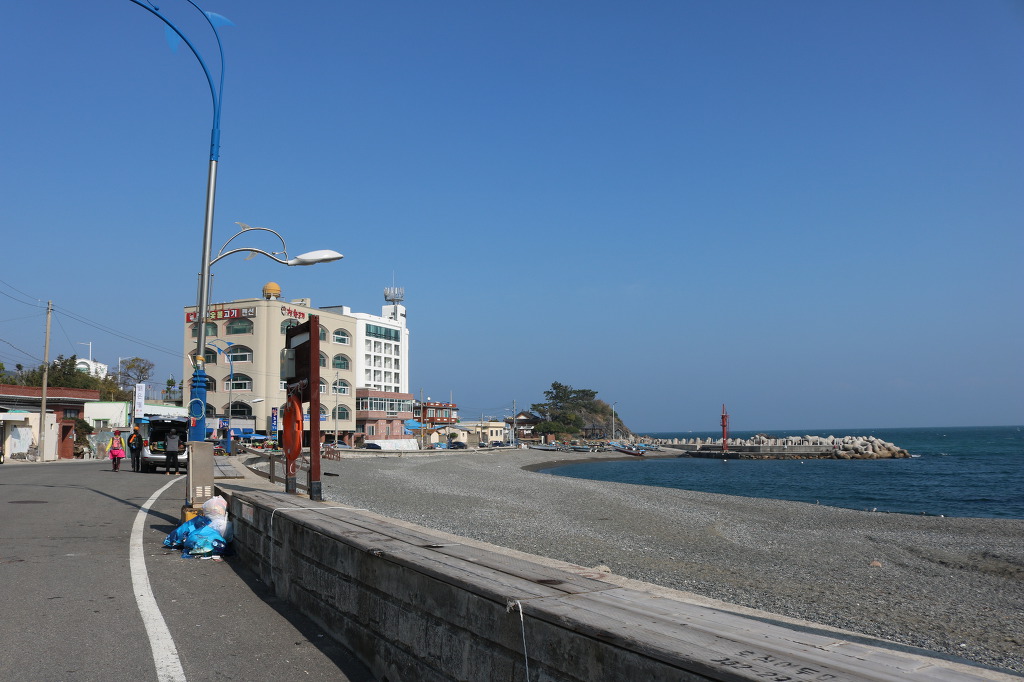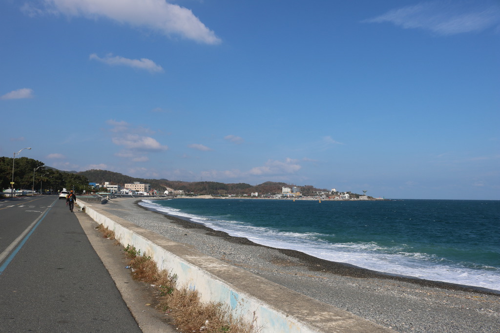 ▼ 또 다시 해안도로를 따른다. 이곳도 역시 모래 대신 크고 작은 몽돌이 해변을 이루고 있다. 아기 손처럼 작은 몽돌부터 어른 몸보다 큰 바위에 이르기까지 크기가 다양한데, 특히 겨울철 파도가 밀려왔다 내려갈 때 몽돌들을 스치며 내는 소리가 매력인 해변이다.