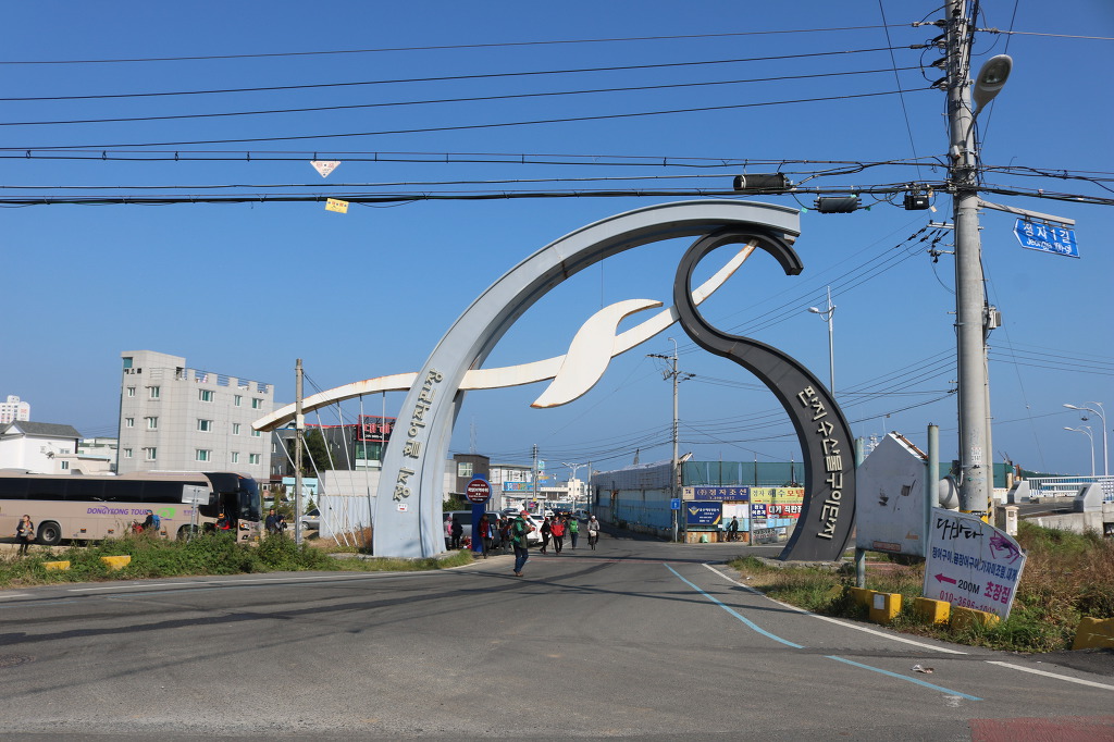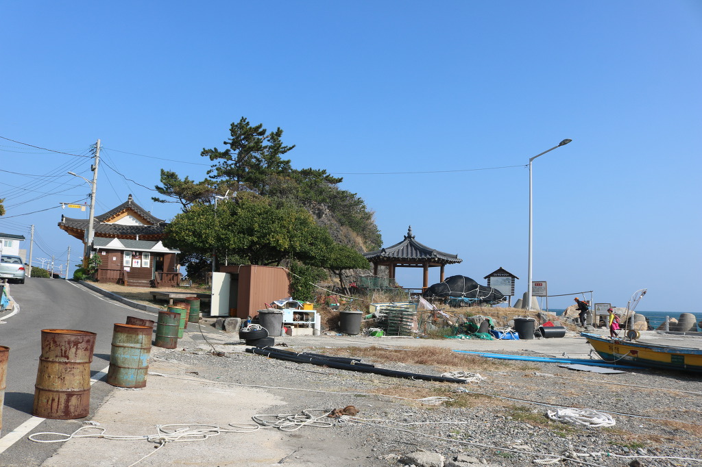 ▼ ‘정자항’으로 들어서니 ‘활어직판장’이 길손을 맞는다. 시작부터 횟집을 찾을 수는 없는 일이라서 그냥 지나치는데 건어물을 파는 노점(露店)들이 길게 늘어서있다. 좌판에는 인근에서 많이 잡힌다는 가자미와 오징어가 따스한 가을 햇볕과 바람에 꾸덕꾸덕 마르고 있다. 하지만 이 또한 그냥 지나치기로 한다. 아무튼 정자항은 생각했던 것보다는 큰 규모이다. 하긴 1971년에 이미 '국가 어항'으로 지정되었다니 그럴 만도 하겠다. 이곳 정자항은 원래 참가자미와 문어로 유명했다. 하지만 최근 동해의 수온 변화로 울진과 영덕에서 주로 잡히던 대게가 정자 인근의 바다에서도 대량으로 잡히기 시작했단다. 그래선지 바닷가에 대게 조형물을 커다랗게 만들어 놓았다. 참고로 ‘정자’라는 마을 이름은 우리가 흔히 보는 ‘정자(亭子)’에서 유래되었다고 전해진다. 옛날 옛적 이곳에 수십 그루의 느티나무가 있었는데 그 사이에 정자가 있었다는 것이다.
